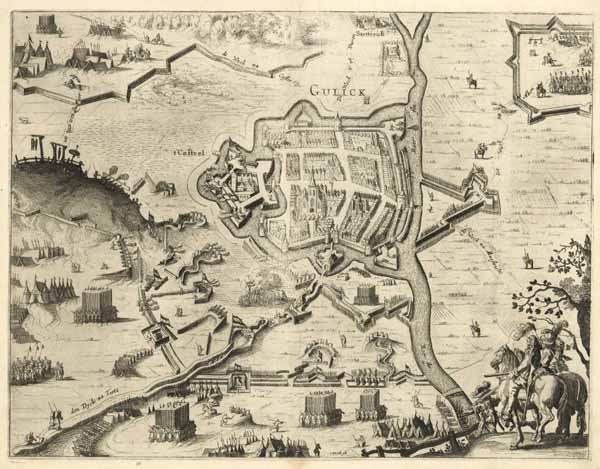 Neumann, Stadt u. Festung Jülich auf bildlichen Darstellungen 59. – Vogelschauansicht von Jülich und Jülich-Stetternich mit Belagerung der Stadt. – Im Vordergrund rechts Reitergruppe.