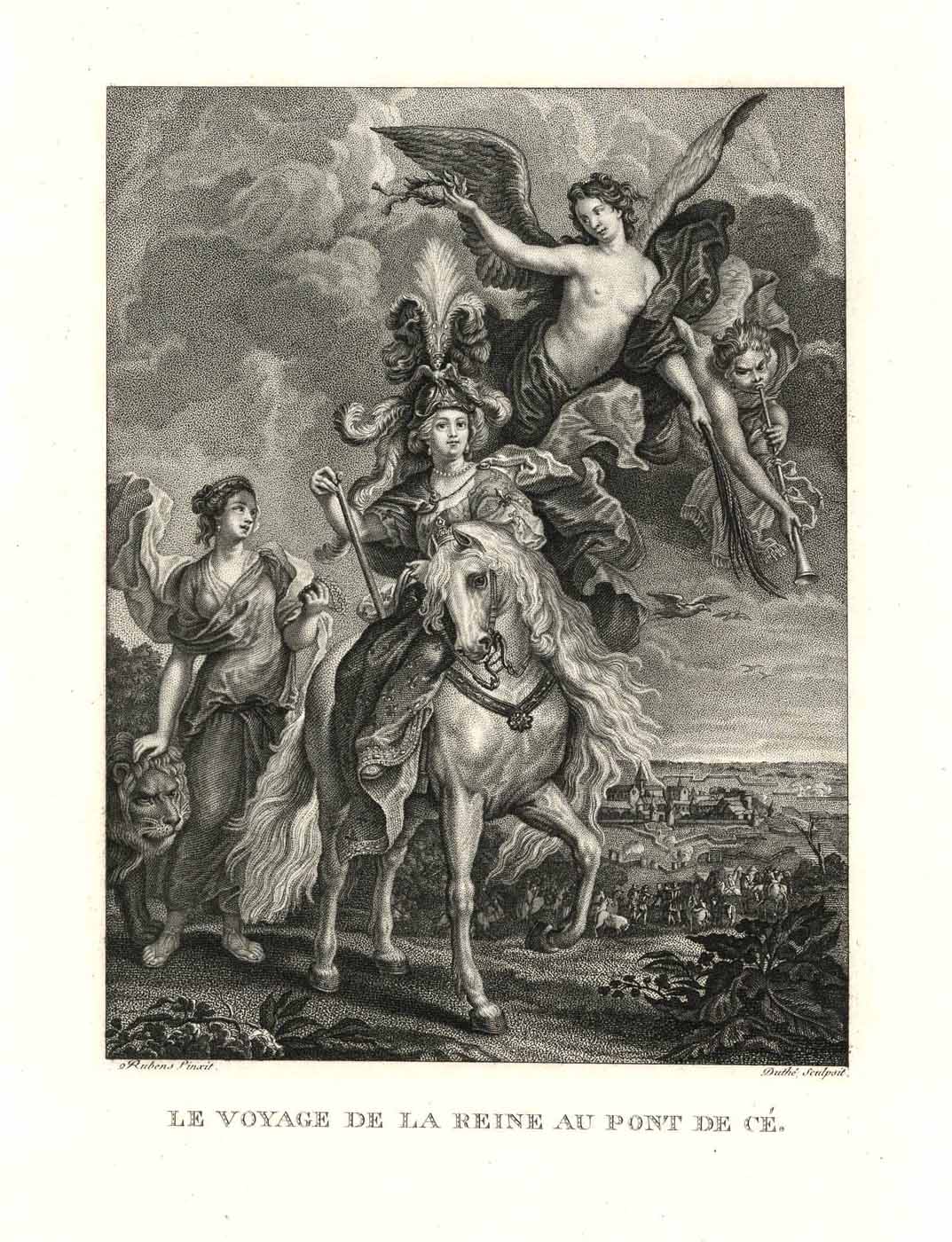 Neumann, Stadt u. Festung Jülich auf bildlichen Darstellungen 72. – Zeigt den Triumph von Jülich im Jahre 1610. – Das Blatt fälschlich als Reise der Königin nach Pont de Cé bezeichnet. – Im Bildvordergrund die Königin Maria umgeben von Allegorien. – Im Hintergrund rechts Stadtansicht von Jülich mit Schlüsselübergabe.