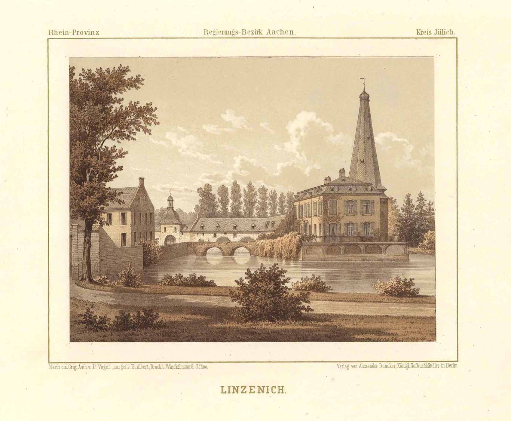 Schloss (Gut) Linzenich, Farblithographie in Brauntönen aus Duncker, 1867, 18,5 x 23,5 cm