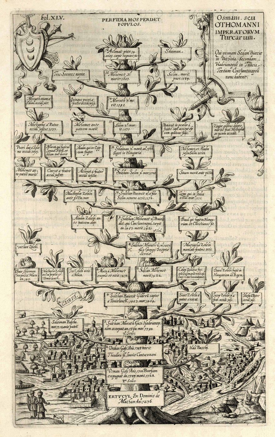 Gesamtansicht; darüber Stammbaum (‘Osmam. seu Othomanni Imperatorum Turcarum – Cairus – Fol. XLV.’), Kupferstich v. David Custos b. Antonio Albizzi in Augsburg, 1609, 29,5 x 23,5 cm