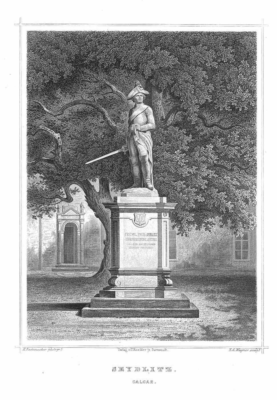 Seydlitz-Denkmal auf dem Marktplatz (‘Seydlitz. – Calcar.’), Stahlstich v. Wagner n. Rademacher, 1862, 18 x 12,5 cm