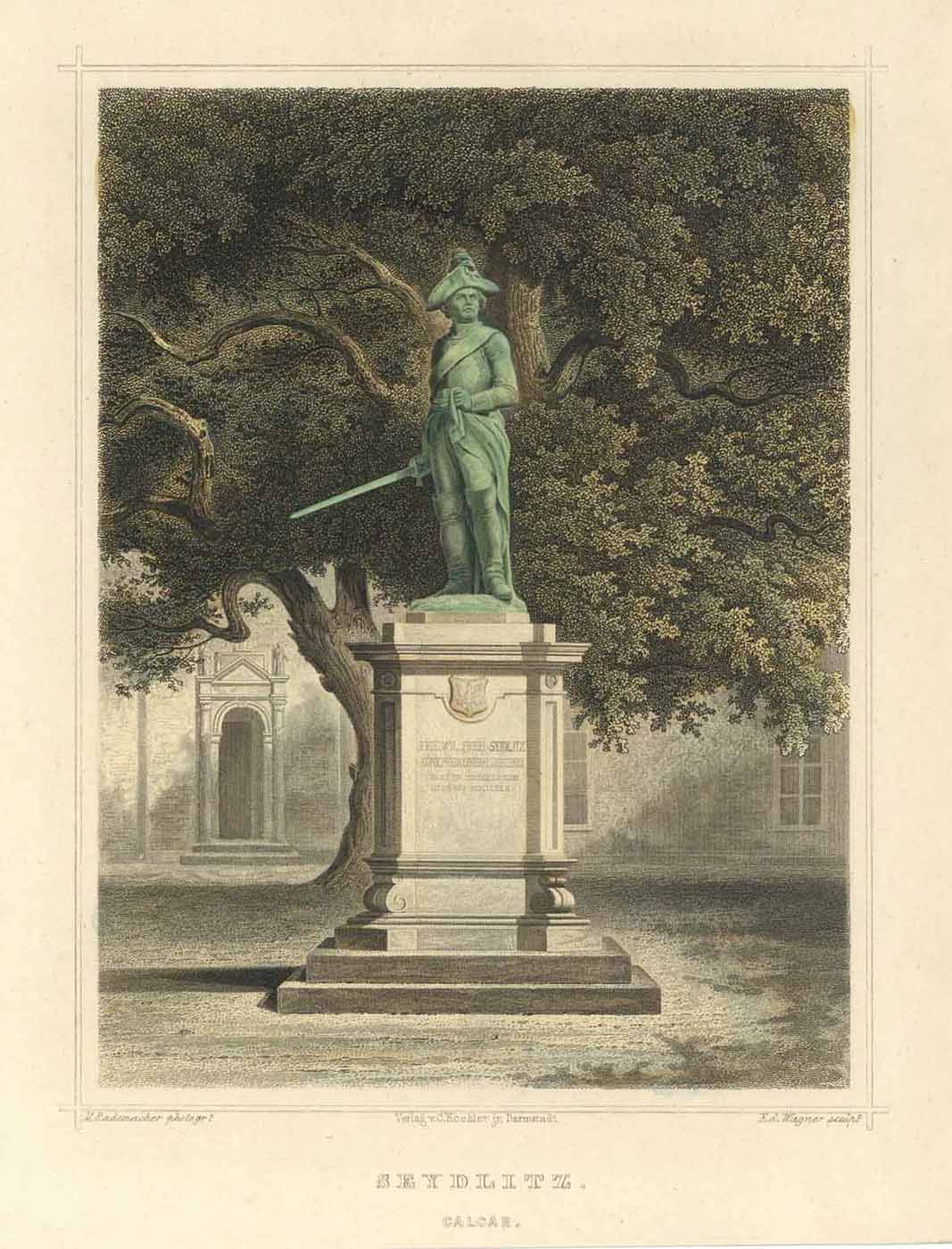 Seydlitz-Denkmal auf dem Marktplatz (‘Seydlitz. – Calcar.’), kolorierter Stahlstich v. Wagner n. Rademacher, 1862, 18 x 12,5 cm