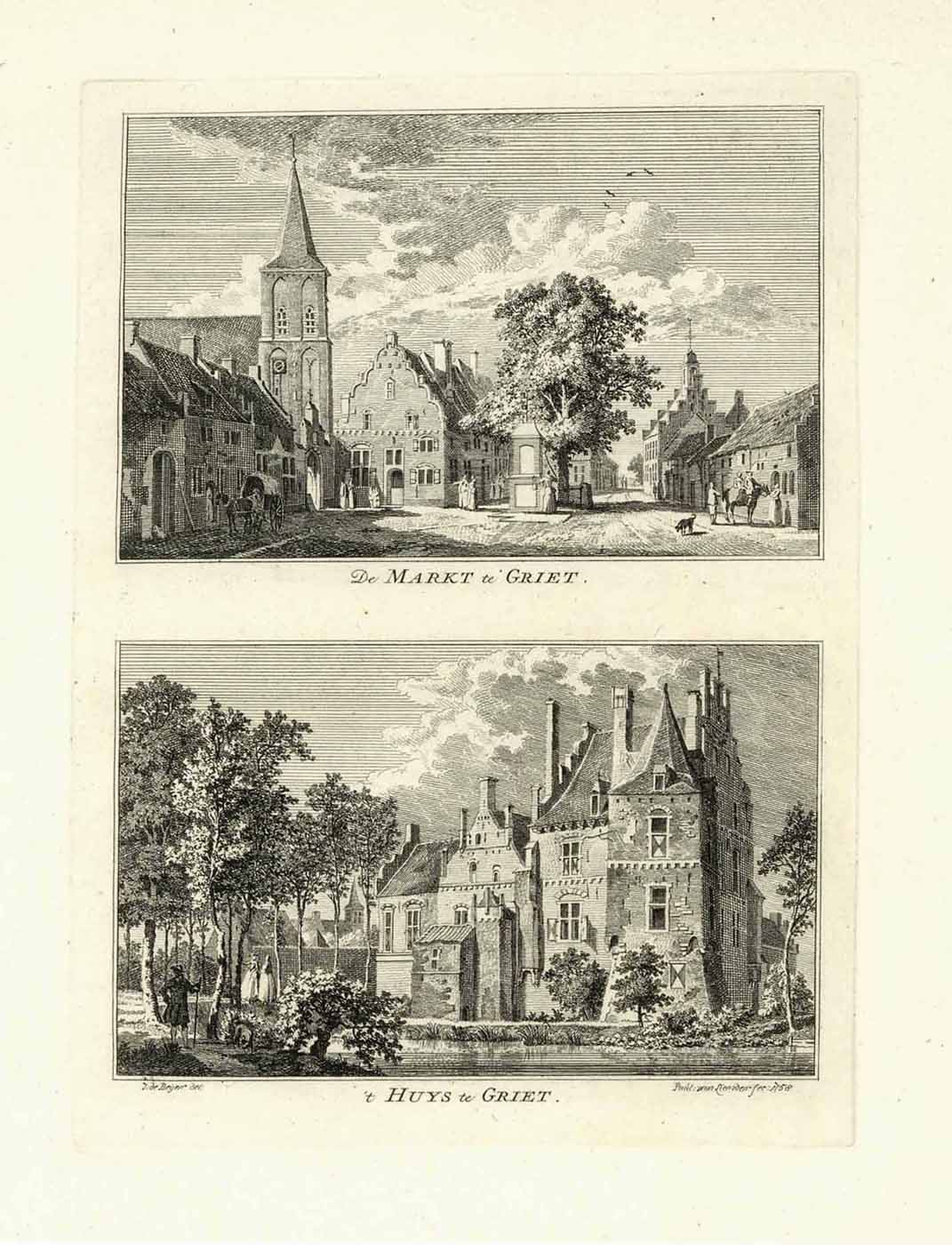 Marktplatz in Grieth und Haus Grieth, Kupferstich v. van Liender n. de Beyer, 1758, 18,5 x 13 cm