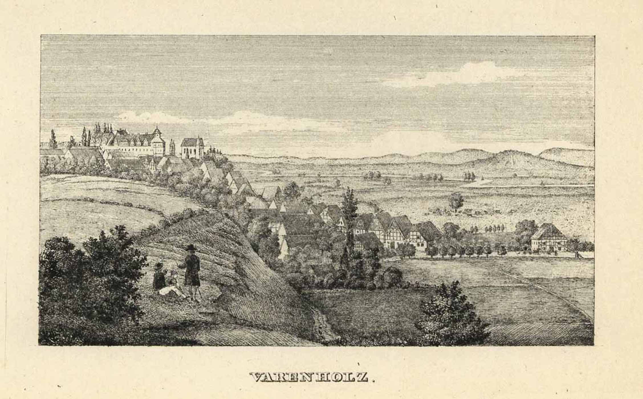 Gesamtansicht mit dem Schloss (‘Varenholz.’), Lithographie v. L. Niebour, 1845, 8,5 x 13,5 cm