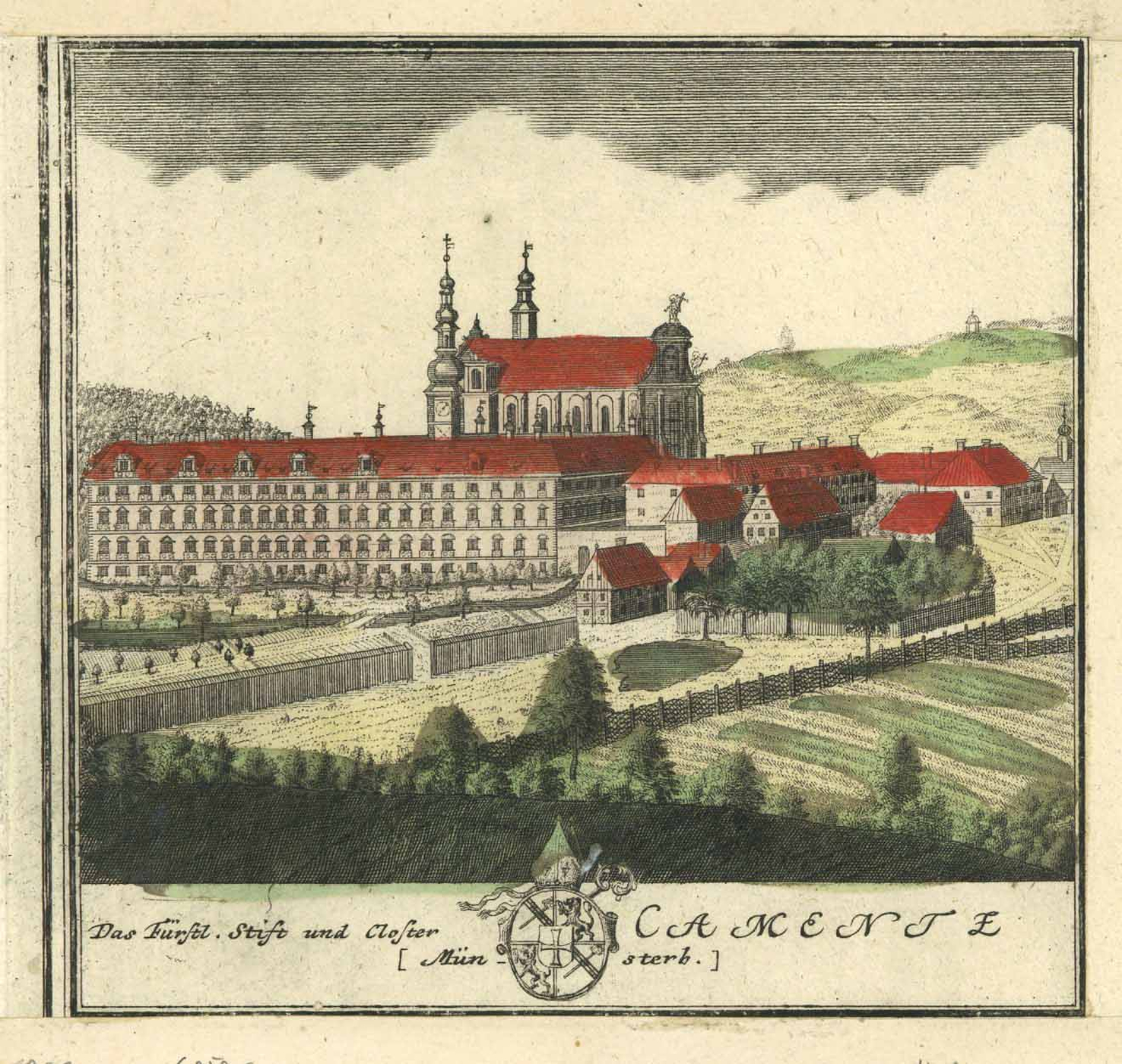 Zisterzienserkloster Kamenz (‘Das Fürstl. Stift und Closter Camentz – Münsterb.’), altkolorierter Kupferstich v. Friedrich Bernhard Werner aus Scenographia Urbium Silesiae b. Homann Erben in Nürnberg, 1737-1752, 14,5 x 15,5 cm