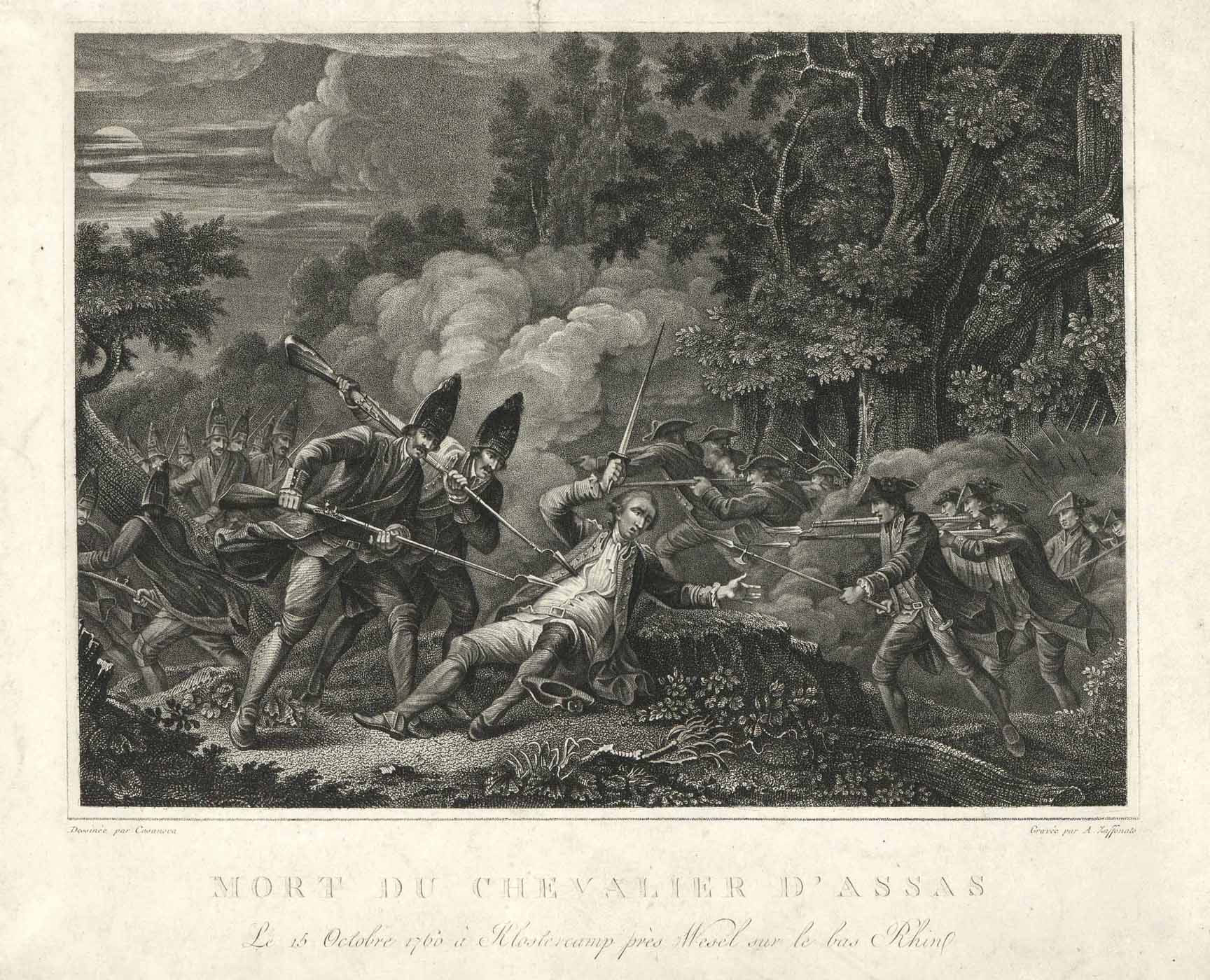 Tod des Offiziers Louis d’Assas im Gefecht bei Kloster Kamp 1760 (‘Mort Du Chevalier D’Assas Le 15 Octobre 1760 à Klostercamp près Wesel sur le bas Rhin’), Lithographie v. A. Zaffonato n. Casanova, um 1830, 25,5 x 29,5 cm
