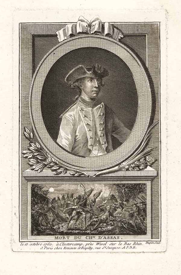 Tod des Offiziers Louis d’Assas im Gefecht bei Kloster Kamp 1760; darüber Porträt von Louis d’Assas (‘Mort Du Cher. D’Assas, le 15. Octobre 1760, à Clostercamp, près Wesel sur le Bas Rhin.’), Kupferstich v. Dupin, um 1760, 19 x 11,5 cm
