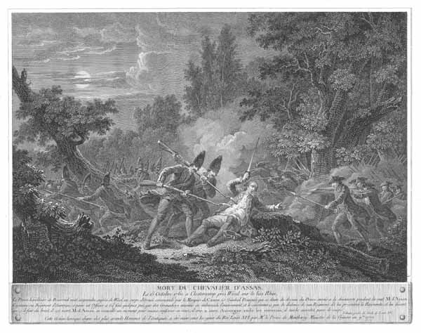Tod des Offiziers Louis d’Assas im Gefecht bei Kloster Kamp 1760 (‘Mort Du Chevalier D’Assas Le 15 Octobre 1760 à Clostercamp près Wesel sur le bas Rhin …’), Kupferstich n. Casanova, dat. 1777, 33,5 x 43 cm