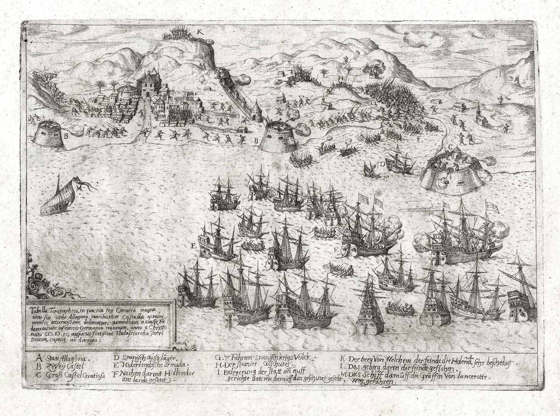 Schlacht vor Las Palmas zwischen den Höllander und Spaniern im Jahre 1599 (‘Tabella Topographica, in qua tota fere Canaria … Petri Dousae captsit ac direpta – A. Die Stadt Allagona’), Kupferstich v. Petri Dousae, dat. 1599, 20,5 x 28,5 cm