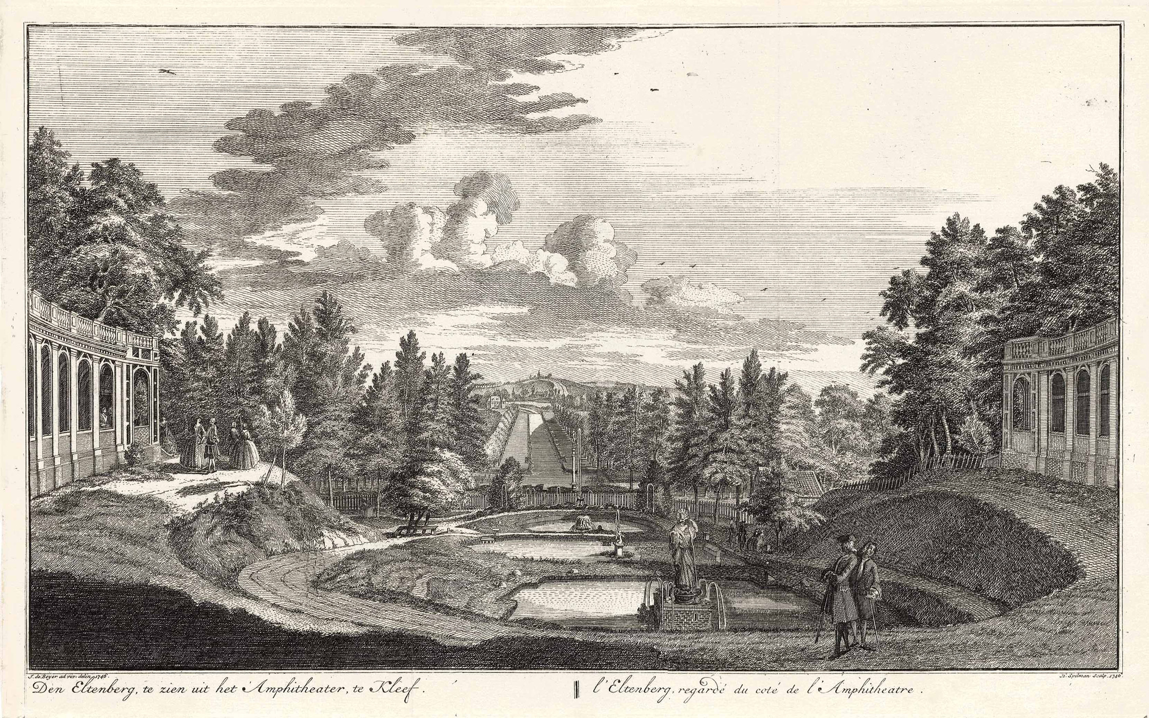Blick vom Amphitheater über das Rheintal auf Elten (‘Den Eltenberg, te zien uit het Amphitheater, te Kleef – l’eltenberg, regardé du coté de l’Amphitheatre’), Kupferstich v. Hendrik Spilman n. Jan de Beyer, dat. 1746 ersch. 1747, 23,5 x 40,5 cm