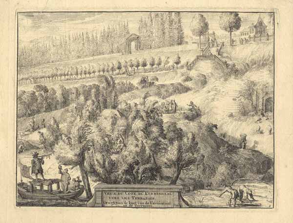 Lustgarten mit Terrassengarten; rechts der Eingang zum Grabgewölbe, das sich Johann Moritz 1656 anlegen ließ (‘Veue Du Cote De Kermisdaal Vers Les Terrasses. Gesigt van de kant van de Kermisdaal na de Terrasses – 1’), Kupferstich v. Romeyn de Hooghe, 1697, 20,5 x 26,5 cm