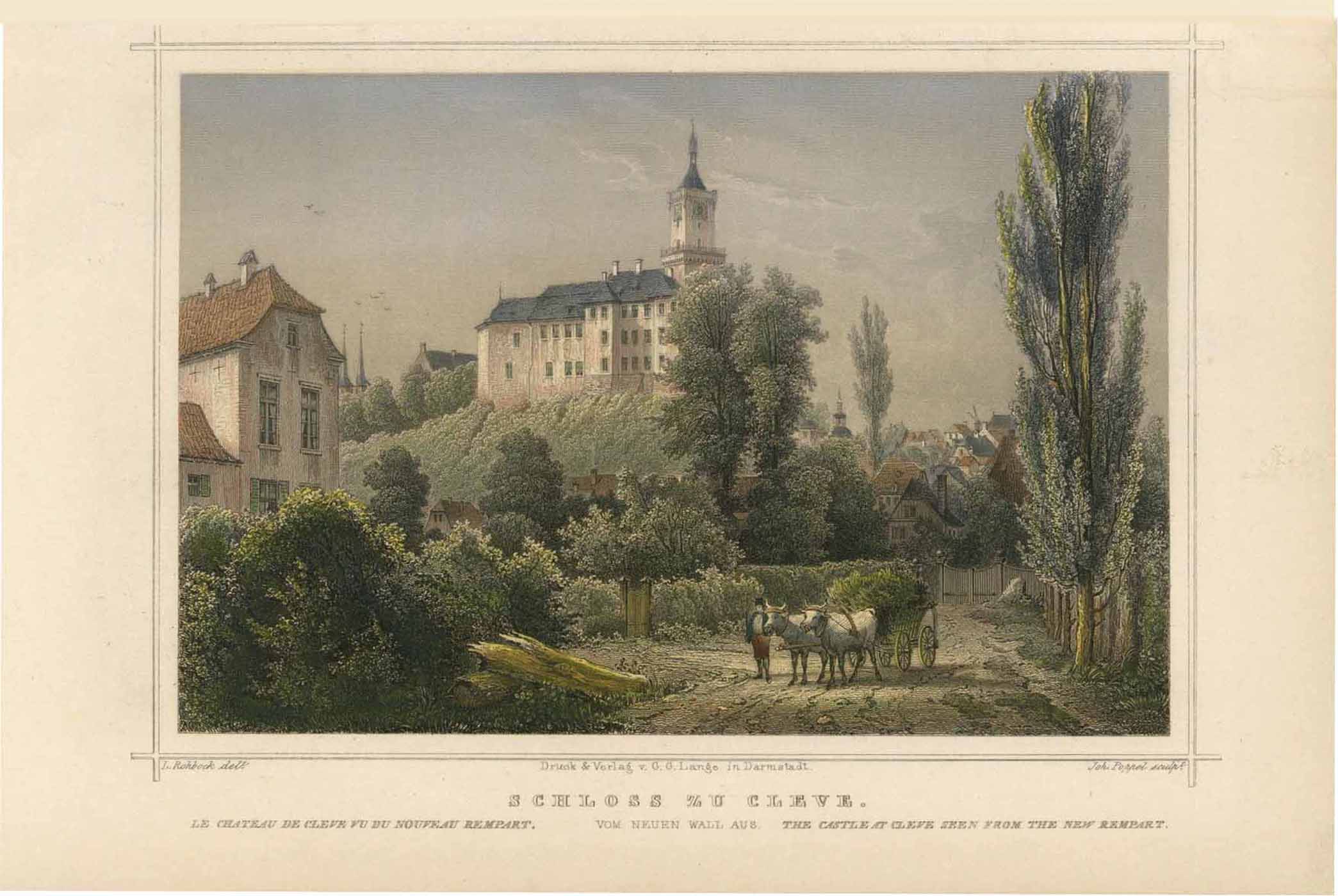 Schwanenburg (‘Schloss zu Cleve vom neuen Wall aus – Le Chateau De Cleve Vu Du Nouveau Rempart – The Castle At Cleve From The New Rempart’), kolorierter Stahlstich v. Poppel n. Rohbock, 1855, 13 x 17,5 cm