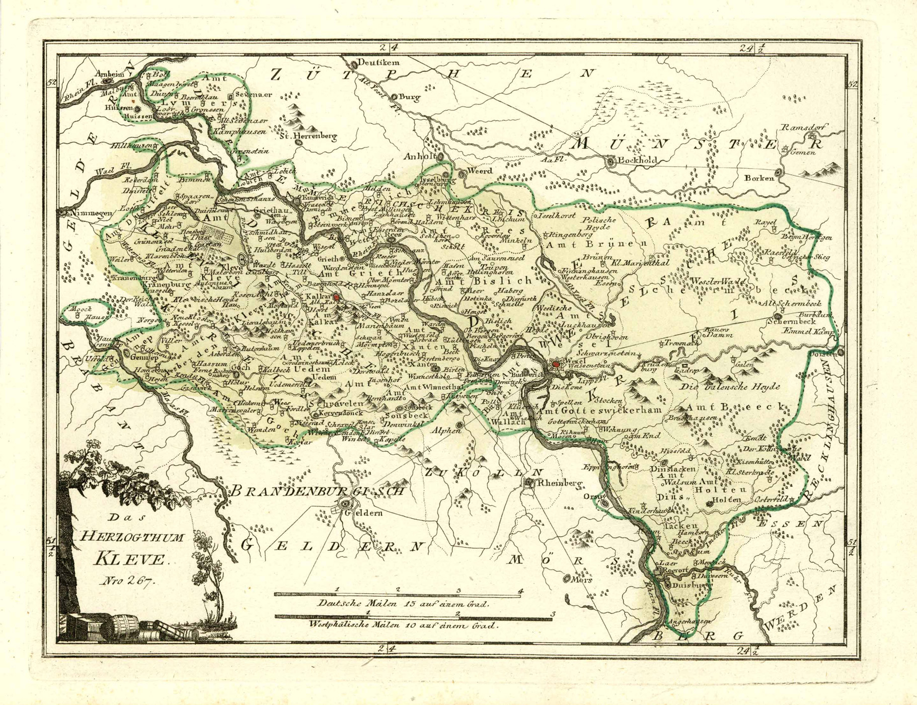 ‘Das Herzogthum Kleve. Nro. 267.’: Altkolorierter Kupferstich v. Franz Johann Joseph von Reilly in Wien, 1791, 25 x 32,5 cm