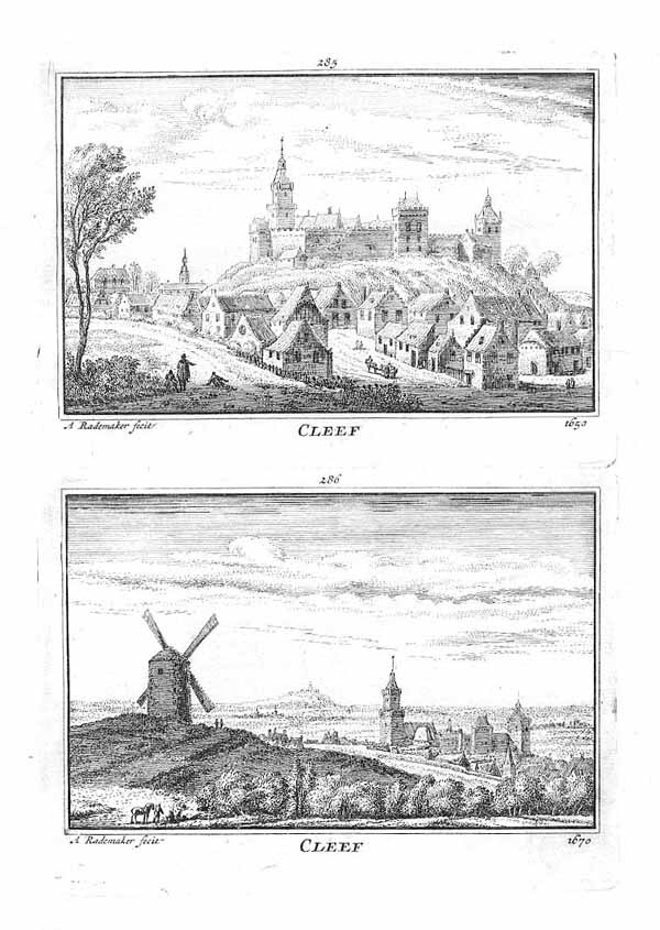 Gesamtansicht vom Mühlenberg u. die Schwanenburg mit Unterstadt (‘Cleef’), Kupferstich v. Abraham Rademaker aus Kabinet van Nederlandsche En Kleefsche Outheden, dat. 1650 u. 1670 ersch. 1733, 15,5 x 11 cm