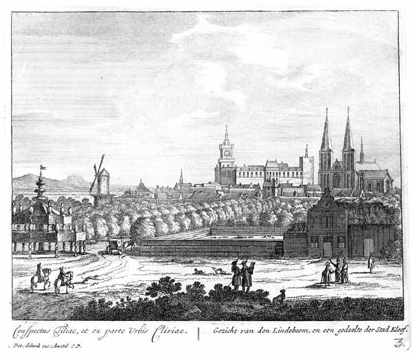 Gesamtansicht von der Linde aus gesehen (‘Gezicht van den Lindeboom, en een gedeelte der Stad Kleef.’), Kupferstich n. Jan van Call aus Schenks Ooge Lust b. P. Schenk in Amsterdam, 1702, 16,5 x 19,5 cm (Sammlung Angerhausen, H 26)