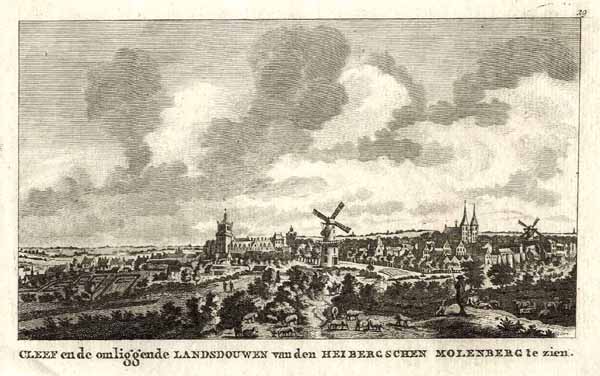 Gesamtansicht (‘Cleef en de omliggende Landsdouwen van den Heibergschen Molenberg te zien’), Aquatinta aus Beknopte Beschrijving van den Rhijn Stroom b. Saakes in Amsterdam, 1794, 10 x 16,5 cm