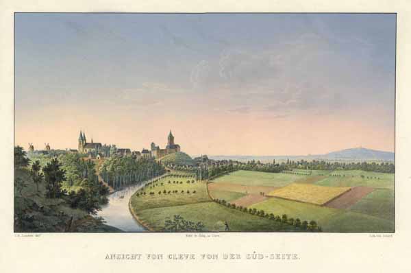 Gesamtansicht von Süden (‘Ansicht von Cleve von der Süd-Seite’), gouachierte u. eiweißerhöhte Lithographie v. Jean Baptiste Jobard n. G.H. Zanders aus Verzameling van 12 Cleefsche Gezigten …, Nimwegen b. J.C. Vieweg & Sohn u. Kleve b. Franz Oellig, 1826, 23 x 40 cm