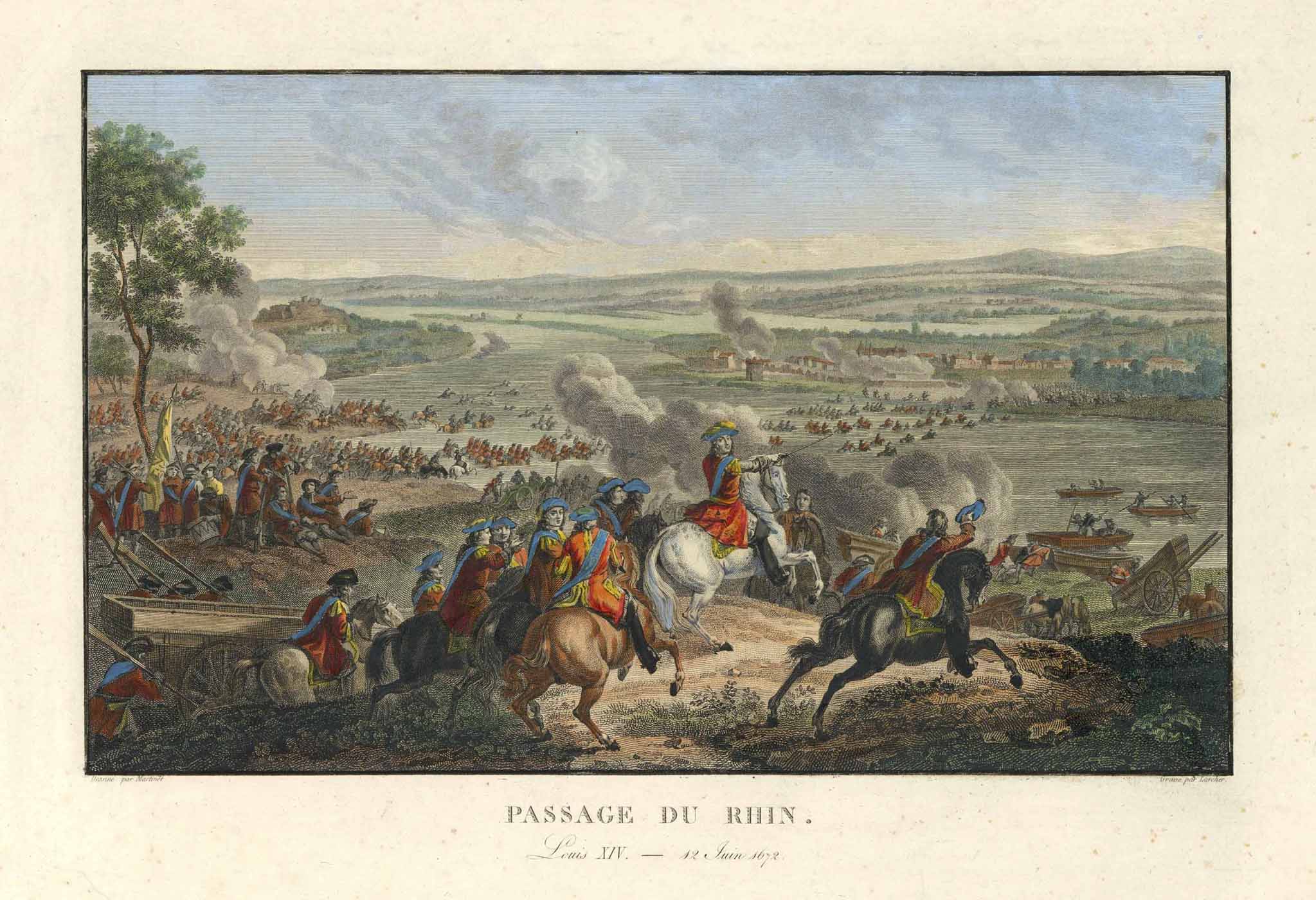 ‘Passage Du Rhin. Louis XIV. – 12 Juin 1672.’, kolorierter u. eiweißgehöhter Kupferstich v. Larcher n. Martinet, um 1830, 22 x 32,5 cm