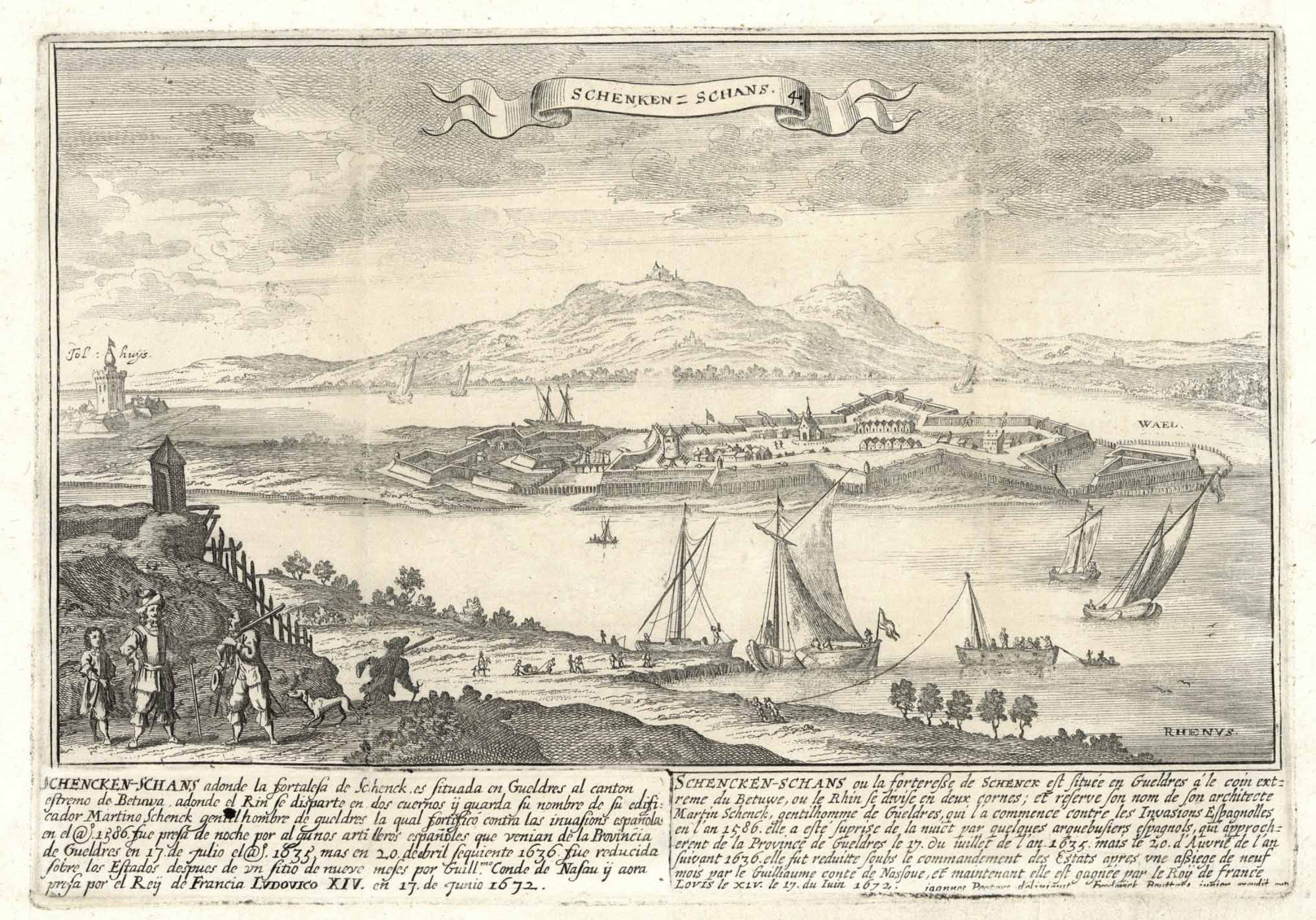 Gesamtansicht (‘Schenken=Schans.’), Kupferstich v. Gaspar Bouttats in Antwerpen n. Johannes Peeters, 1672, 16,5 x 24 cm