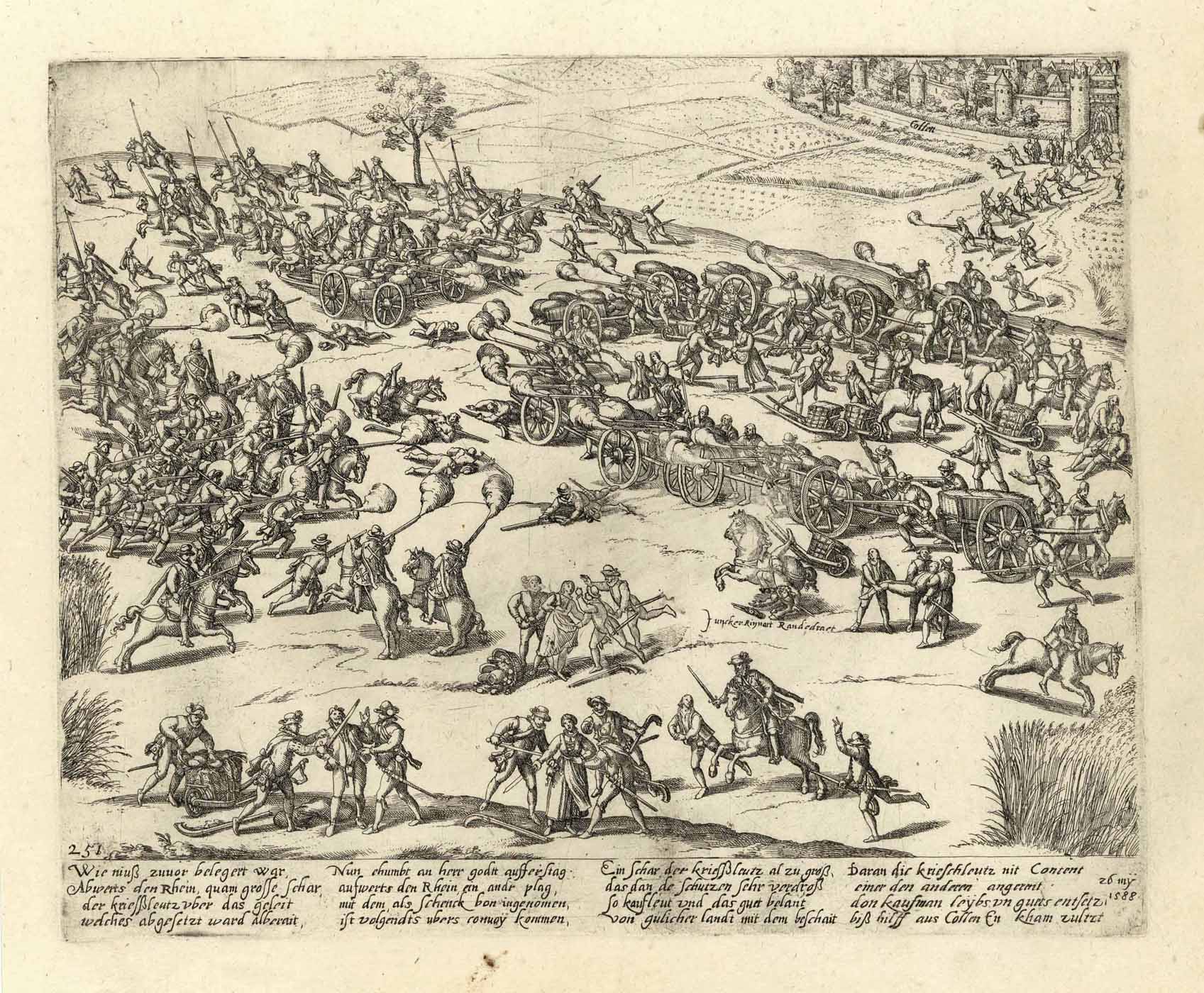 Ansicht mit dem Überfall durch Schenk’sche Truppen vor Köln am 26.5.1588 (‘Collen – 251’), Kupferstich aus Hogenbergs Geschichtsblätter, 1588, 21,5 x 26,5 cm