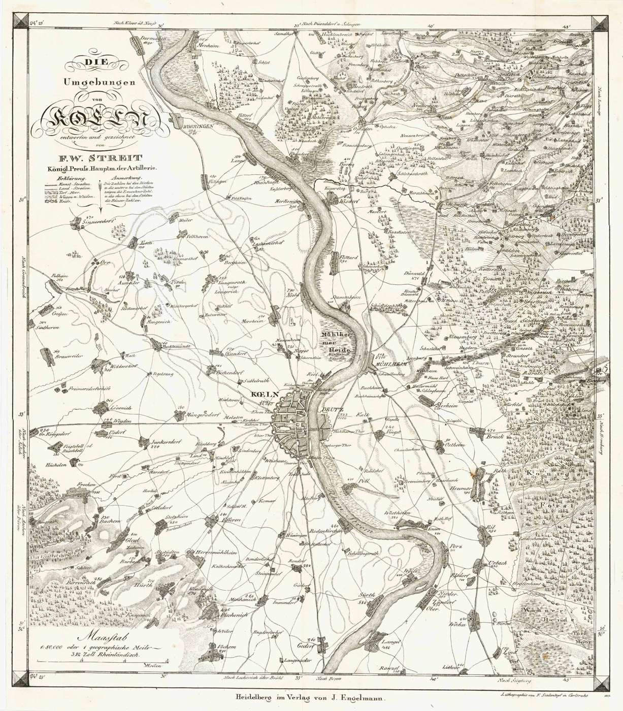 ‘Die Umgebungen von Koeln entworfen und gezeichnet von F.W. Streit Königl. Preuss. Hauptm. der Artillerie – Heidelberg Im Verlag bei J. Engelmann. – Lithographie von F. Siedenkopf in Carlsruhe 1826’: Lithographie v. F. Siedenkopf n. Friedrich Wilhelm Streit b. Joseph Engelmann in Heidelberg, dat. 1826, 35,5 x 31,5 cm