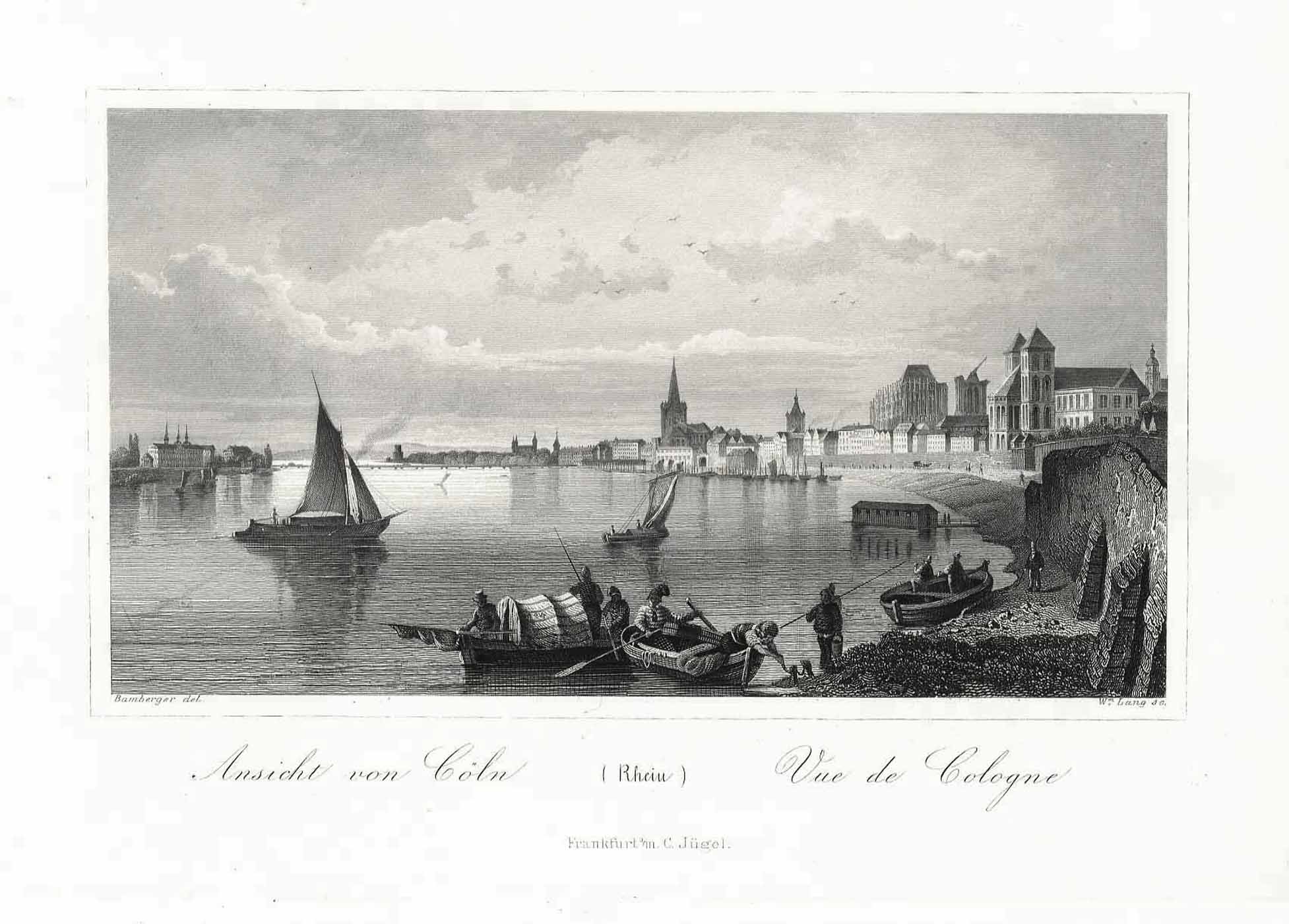 Gesamtansicht von Norden; rechts die Kirche St. Kunibert; links Deutz (‘Ansicht von Cöln (Rhein) – Vue de Cologne’), Stahlstich v. Lang n. Bamberger b. Carl Jügel in Frankfurt, 1844, 11,5 x 18,5 cm