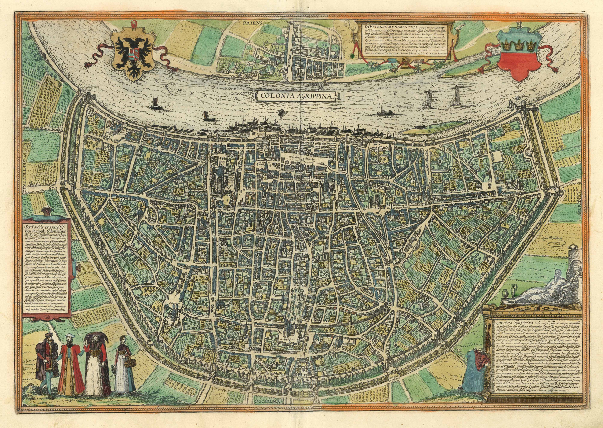 van der Krogt, Koeman’s Atlantes Neerlandici, Vol. IV-2, Köln:41.2; Clemen, Die Kunstdenkmäler der Stadt Köln, Nr. 32, S. 91. – 1. Zustand mit 4 Personen unten links (männlicher Patrizier) und 3 weibliche Personen (Patrizierinnen und Magd).