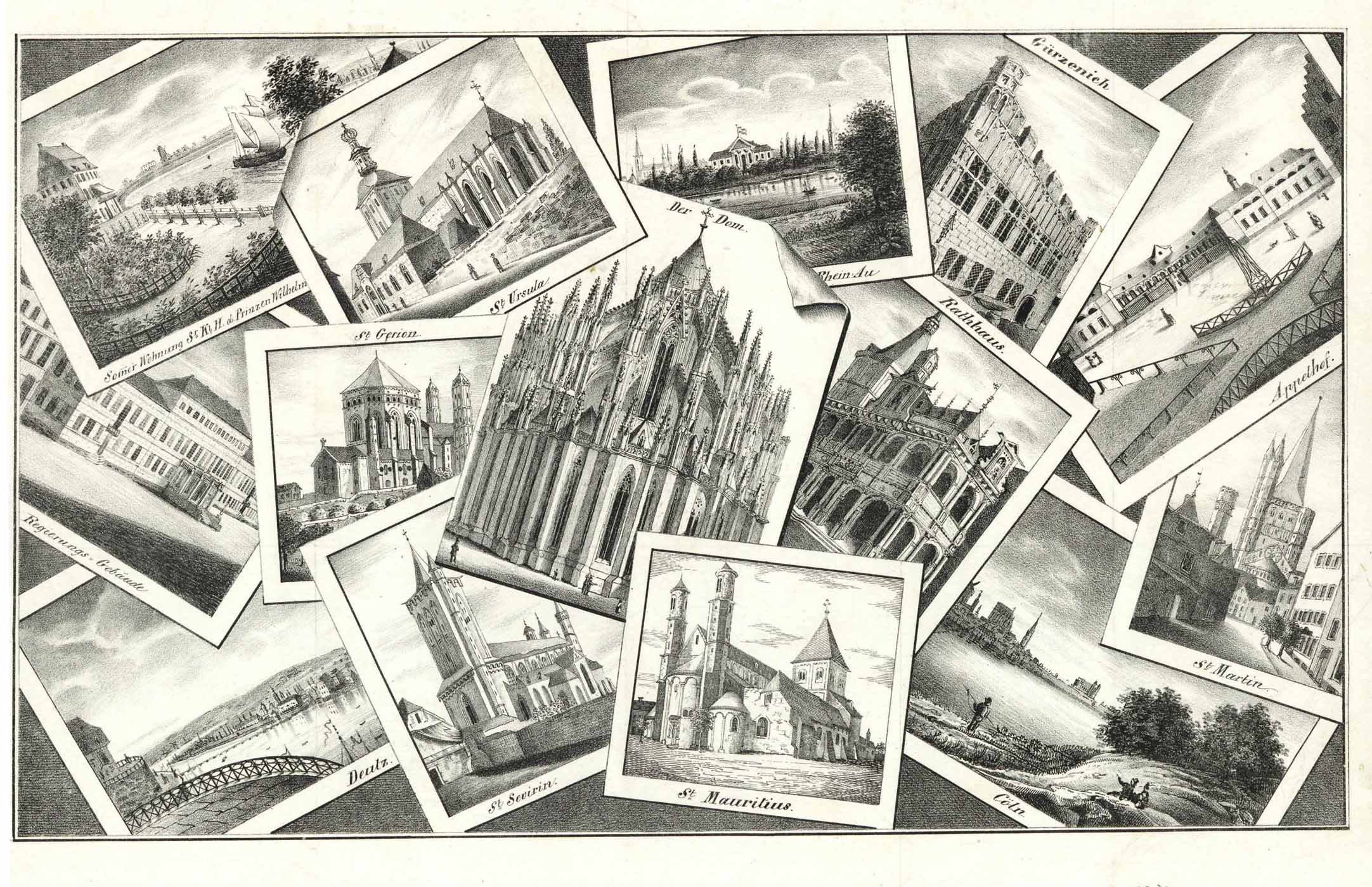 Seltenes Quodlibet mit 14 Ansichten. – Zeigt eine Gesamtansicht von Köln und Deutz, St. Martin, St. Mauritius, St. Severin, St. Gereon, St. Ursula, Dom, Rathaus, Gürzenich, Regierungsgebäude, Sommerwohnung seiner kgl. Hochheit Prinz Wilhelm, Rheinau und der Appelhof.