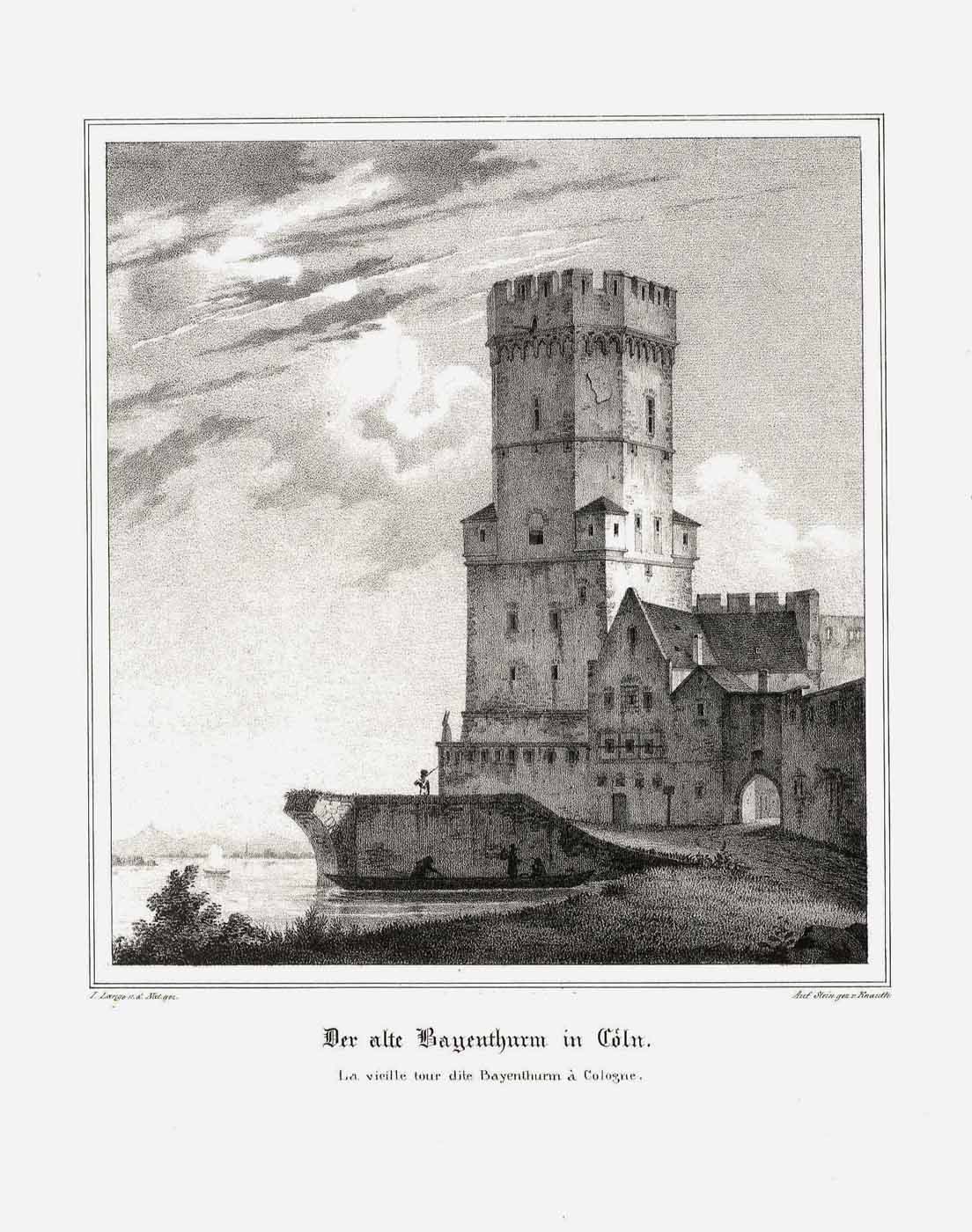 Bayenturm; links im Hintergrund der Rhein und Blick auf das Siebengebirge (‘Der alte Bayenthurm in Cöln. – La vieille tour dite Bayenthurm à Cologne.’), Lithographie v. Knauth n. L. Lange gedr. B. Strixner u. Zach in München b. C. Jügel in Frankfurt, 1843, 19 x 16 cm