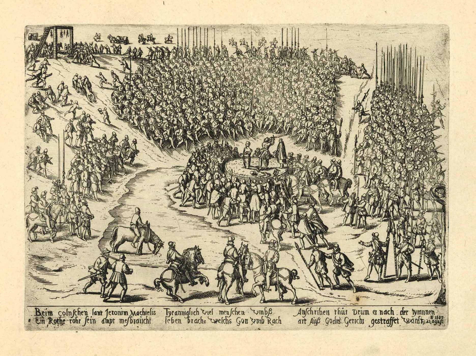 Hinrichtung des Jeronim Machielis (Hieronymus Michiels) in Köln am 21.8.1587, Kupferstich aus Hogenbergs Geschichtsblätter, 1587, 18,5 x 26 cm