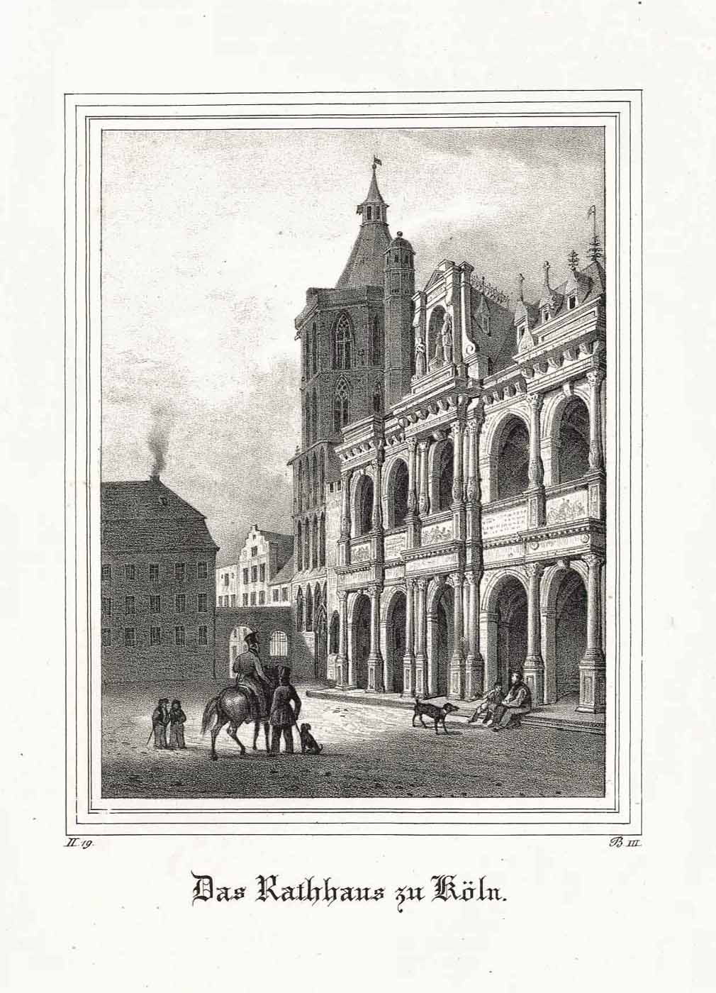 Rathaus (‘Das Rathaus zu Köln.’), Lithographie aus Borussia, 1839, 18 x 12,5 cm