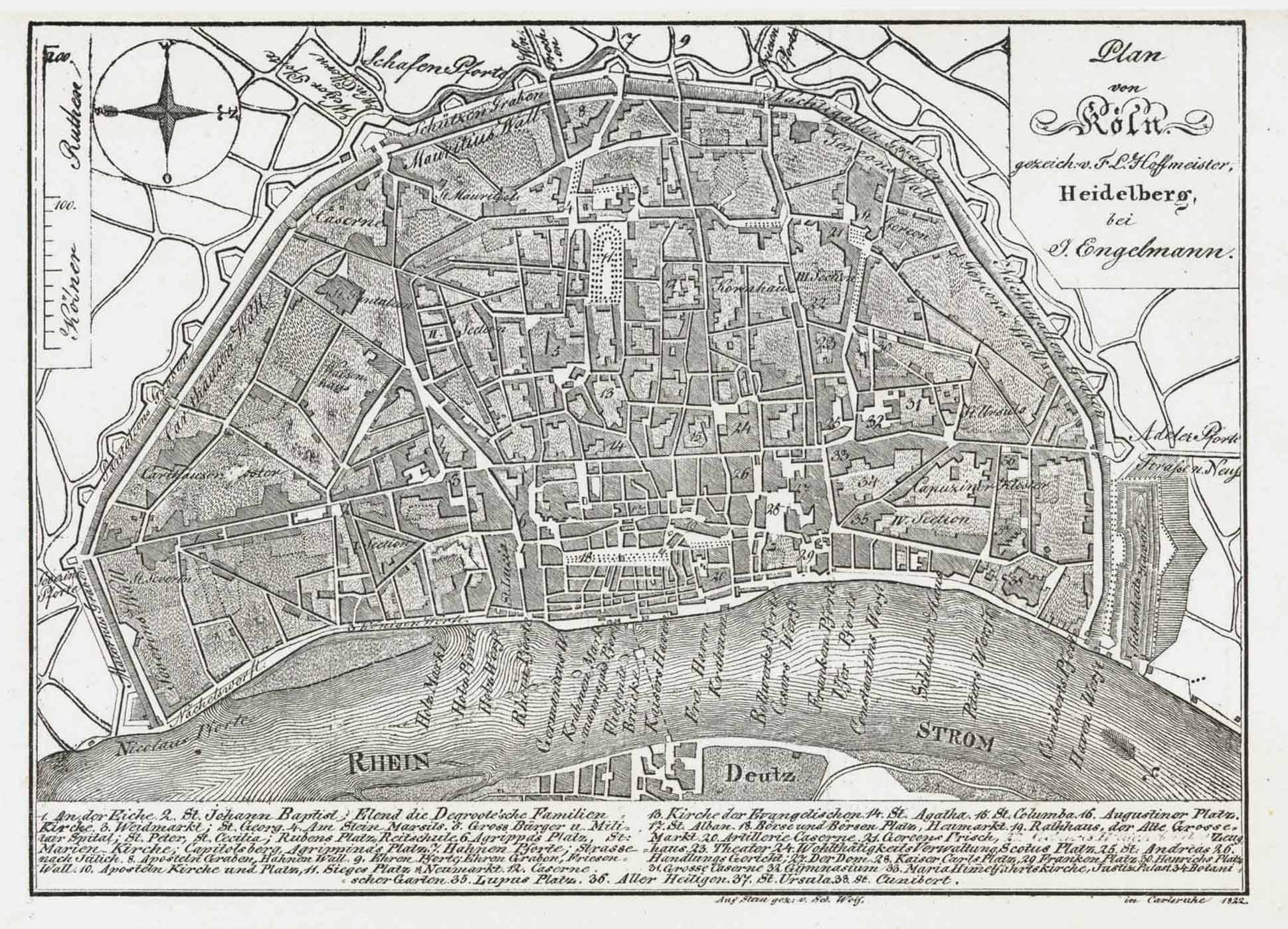 Stadtplan (‘Plan von Köln’), Lithographie v. Seb. Wolf n. F.L. Hoffmeister b. Engelmann in Heidelberg, dat. 1822, 16 x 22 cm