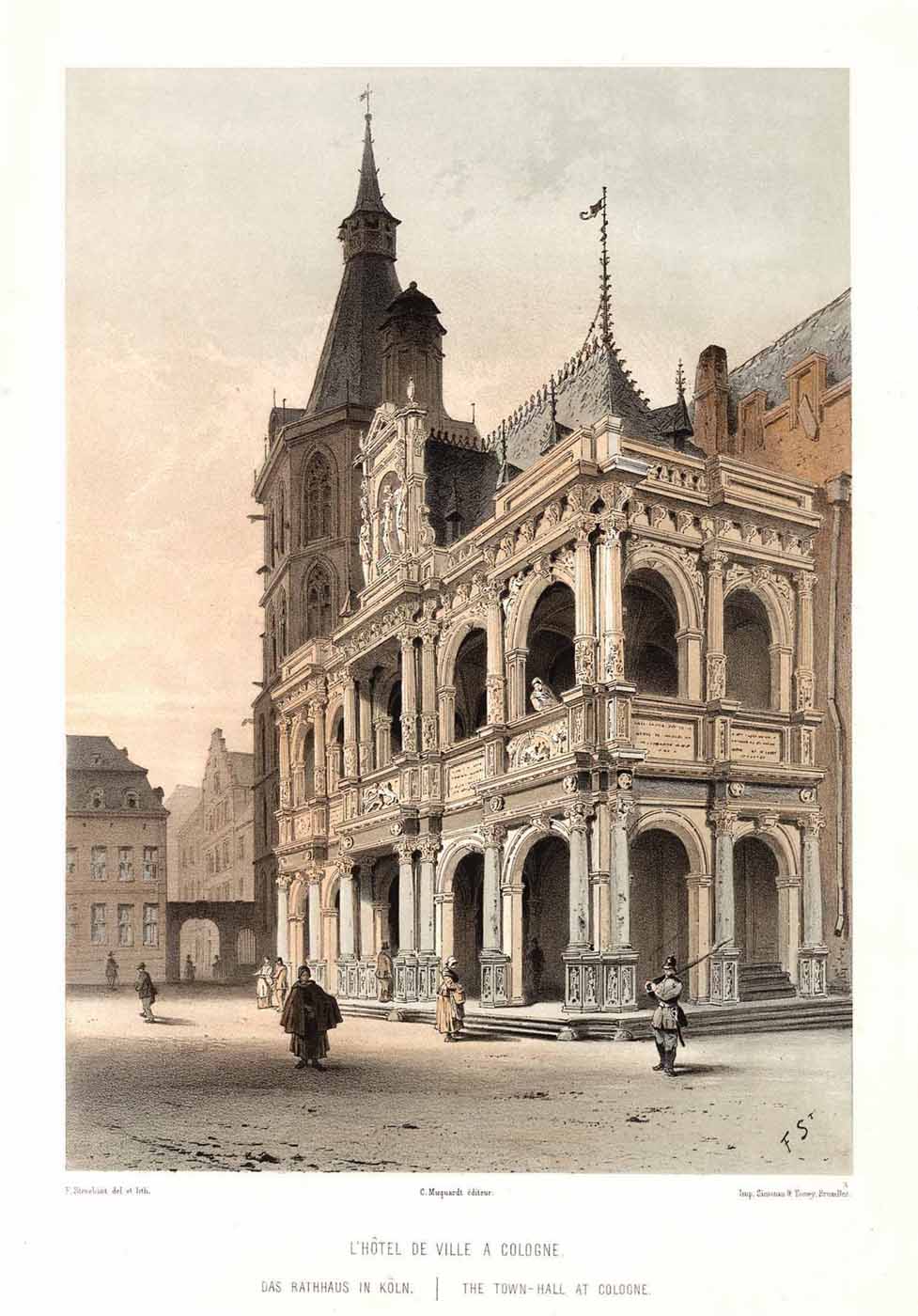 Rathaus (‘L’Hôtel de Ville A Cologne. Das Rathhaus In Köln. – The Town-Hall At Cologne – F St’), Farblithographie v. Francois Stroobant gedr. b. Simonau & Toovey in Brüssel b. Charles Muquardt, 1854, 33 x 22,5 cm