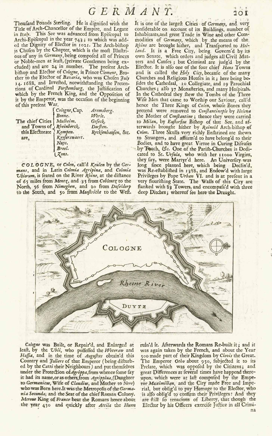 Befestigunsplan (‘Cologne – Duytz’), Kupferstich v. Herman Moll b. Abel Swall & Timothy Child in London, 1695, 9 x 13,5 cm (Ganze Buchseite)