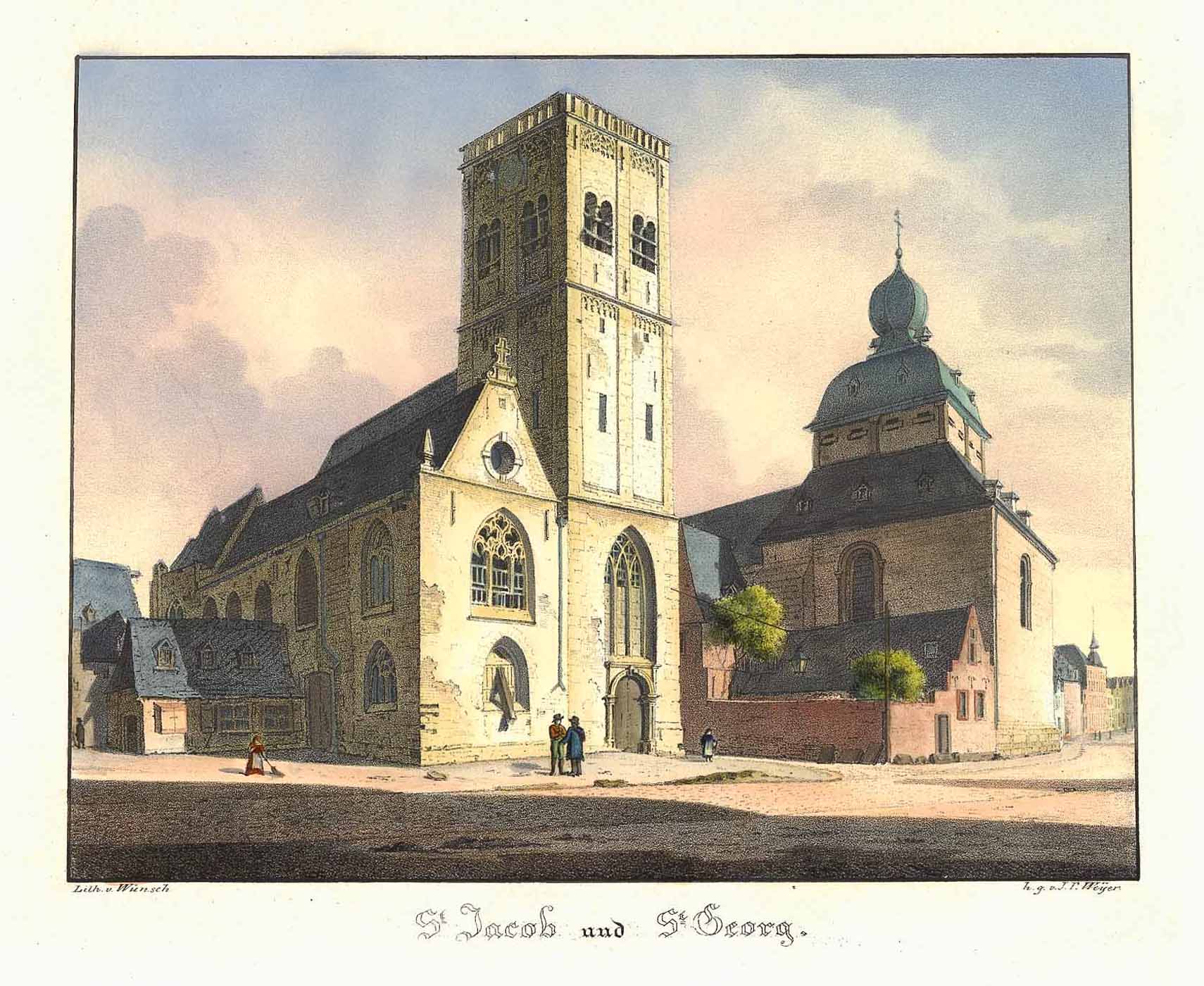 St. Georg Kirche gegenüber dem Waidmarkt (‘St. Jacob und St. Georg’), gouachierte u. eiweißgehöhte Lithographie v. Wünsch n. Weyer, 1827, 21 x 25,5 cm