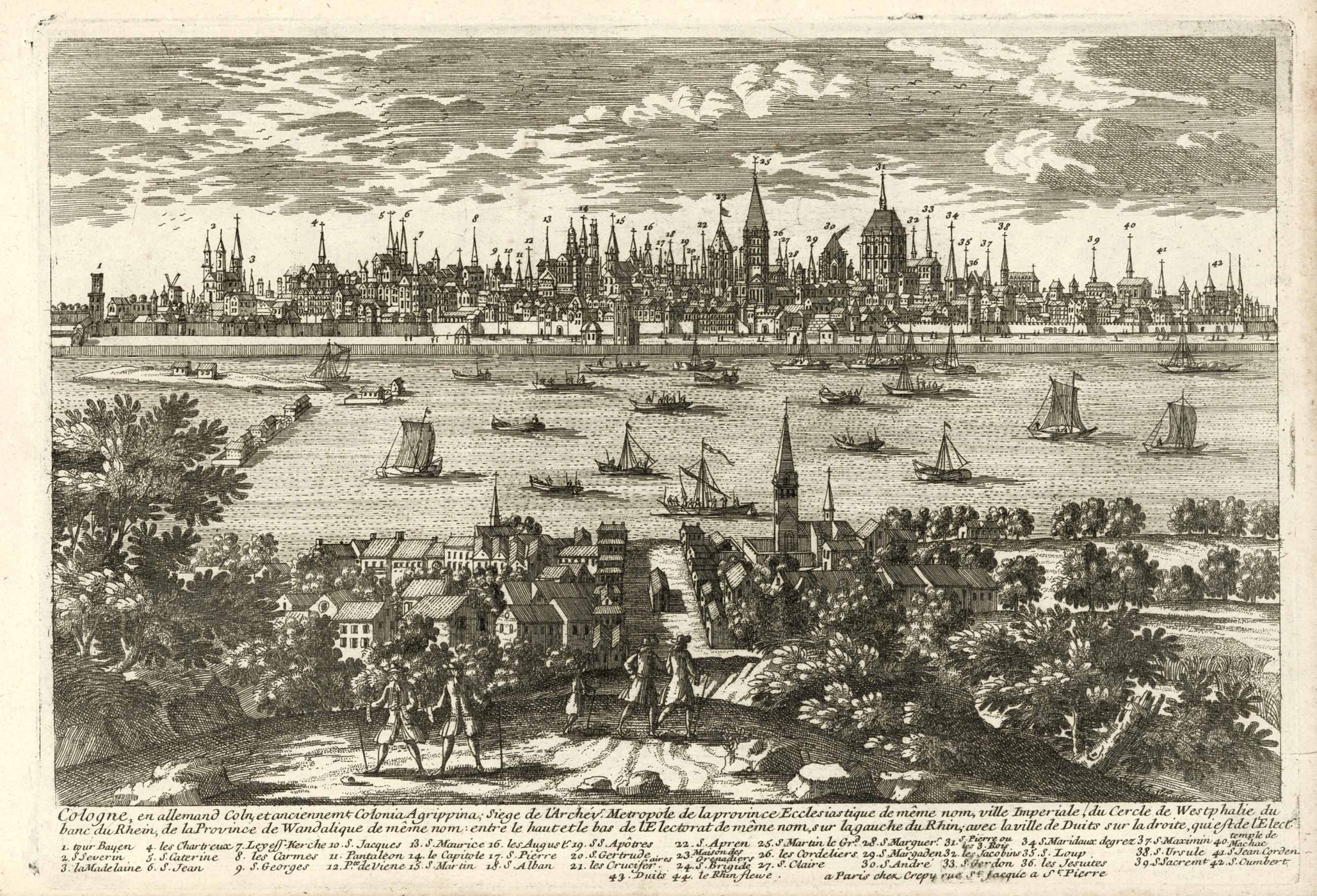 Gesamtansicht über den Rhein (‘Cologne, en allemand Coln, et anciennement Colonia Agrppina …’), Kupferstich b. Crepy, um 1770, 21,5 x 31,5 cm