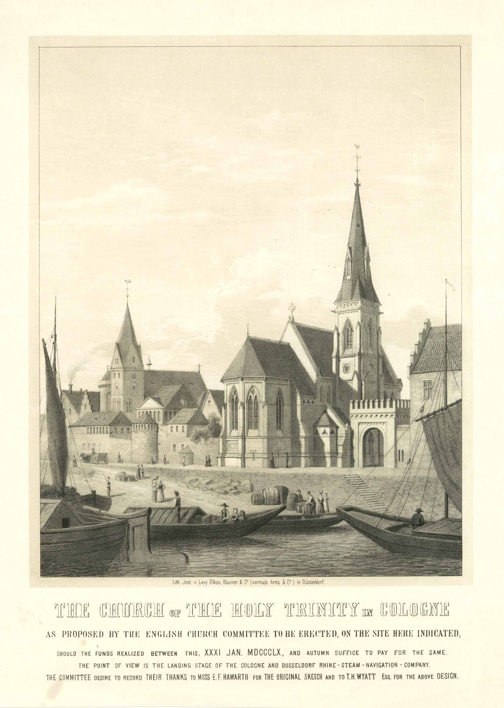 Es handelt sich um die geplante, von britischen Anglikanern intiierte “Church of the Holy Trinty”, die am Rheinufer von Köln errichtet werden sollte. – Der Text erläutert, dass dies ein Entwurf für das englische Kirchenkomitee ist und die Kirche an einem Landeplatz der damaligen Köln-Düsseldorfer Dampfschifffahrtsgesellschaft gebaut werden sollte, vorausgesetzt, der erforderliche Betrag würde bis zum 31. Januar 1860 zusammenkommen. – 1861 wurde die Kirche tatsächlich in Köln errichtet und war bekannt als “Englische Kirche”. – Sie befand sich in der Rheingasse. – Im Zweiten Weltkrieg wurde sie zerstört und nicht mehr aufgebaut.