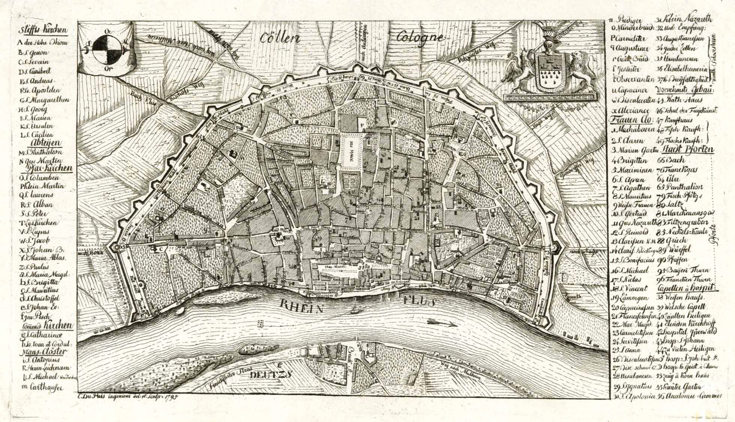 Merlo, Kölnische Künstler, S. 203f. – Charles Dupuis war Artillerie-Lieutenant und Kabinetszeichner in Diensten der Kurfürsten Max Friedrich und Max Franz von Köln, eine Stellung, die ihn zunächst an die Residenzstadt Bonn fesselte. – Ab 1794 lebte er in Köln. – Seltener Plan mit seitlichen Legenden, der im “Adresse-Kalender der Stadt Köllen. Köllen, in dem Bureau des französischen Journals” erschien.