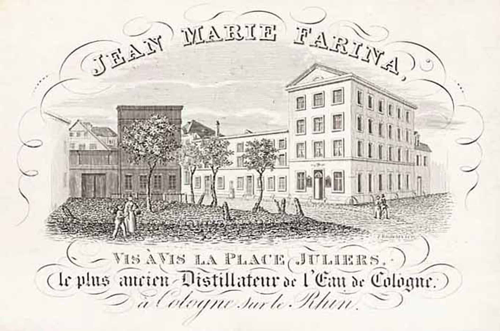 Farina-Haus gegenüber dem Jülichs-Platz (‘Jean Marie Farina, Vis à Vis La Place Juliers, le plus ancien Distillateuer de l’Eau de Cologne, à Cologne sur le Rhin.’), Stahlstich b. F. Heinrigs in Köln, um 1850, 8 x 12 cm (Visitenkarte)