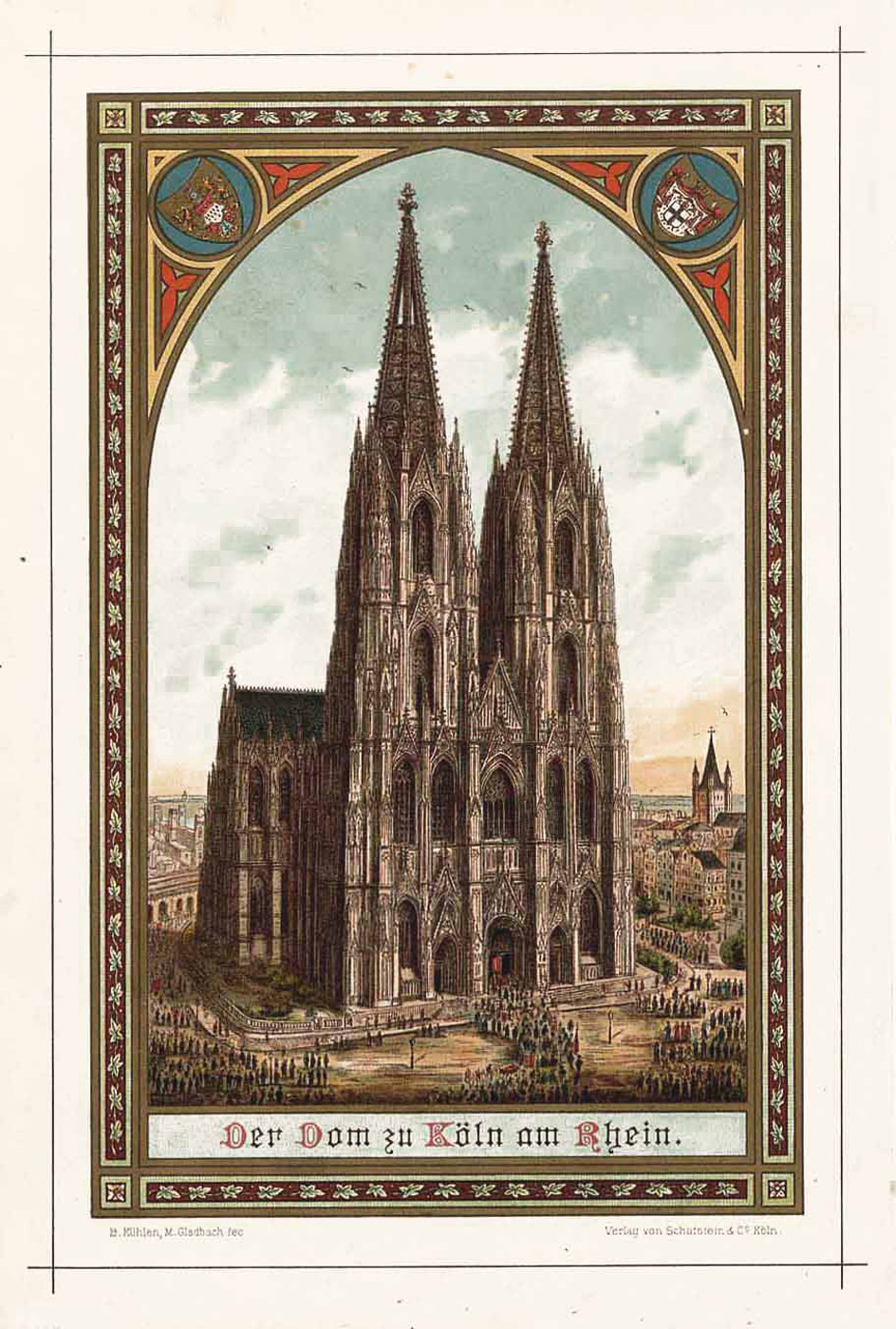 Dom in der Vollendung mit Prozession im Vordergrund; rechts Groß St. Martin (‘Der Dom zu Köln am Rhein’), Farblithographie v. Kühlen b. Schafstein & Co. in Köln, 1877, 21 x 13,5 cm