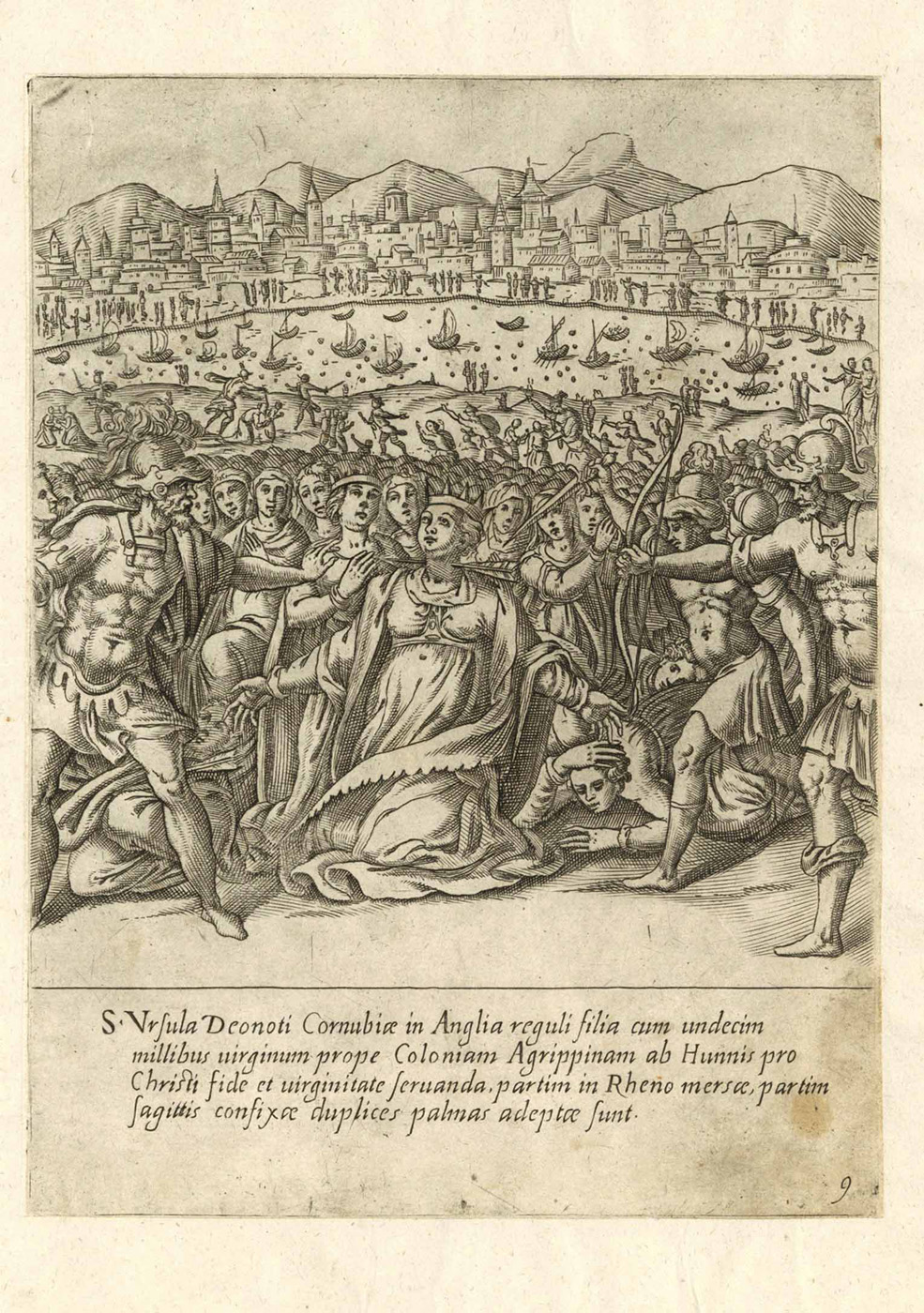 Nicht bei Sievers, Köln von seiner schönsten Seite. – Zeigt die tiefgläubige Ursula samt der sie begleitenden elftausend Jungfrauen während einer Wallfahrt wie sie als Märtyrerin vor Toren Kölns ermordet wird. – Im Hintergrund die Stadt Köln über den Rhein gesehen. – Sehr selten.