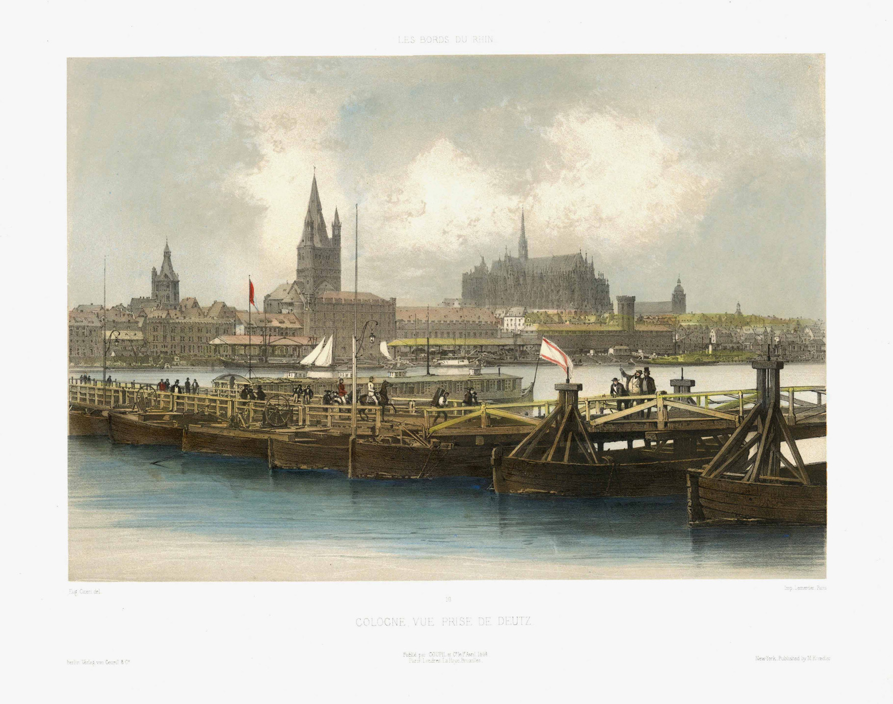 Gesamtansicht über den Rhein; im Vordergund die Schiffsbrücke (‘Cologne Vue Prise De Deutz’), altkolorierte u. eiweißgehöhte Lithographie v. Eugène Cicéri aus Les Bords Du Rhin b. Coupil in Berlin, Paris, Brüssel, den Haag & London, dat. 1864, 32,5 x 39,5 cm