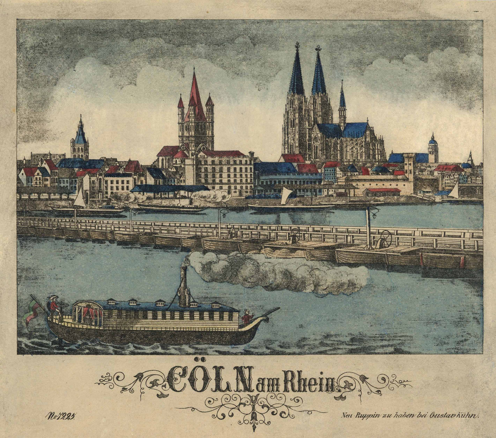 Neuruppiner Bilderbogen. – Gustav Kühn (1794 – 1868) übernahm die Geschäfte seines Vaters im Jahre 1822. – Unter seiner Leitung zeichnete er die Bildbögen. – Diese meist handkolorierten Neuruppiner Bilderbogen erlangten weltweite Verbreitung und gelten als Vorläufer der Illustrierten Zeitung. – 1939, zur 700-Jahr-Feier der Stadt Neuruppin, erschien mit der Nummer 10.337 der letzte Bilderbogen der Firma Kühn. – Unser Bilderbogen trägt die Nr. 7225. – Die Deutzer Schiffbrücke verband von 1822 bis 1915 als Pontonbrücke die Rheinufer zwischen Deutz und Köln. – Der Kölner Dom ist in seiner Vollendung dargestellt. – Restauriert und auf Japanpapier montiert. – Sehr selten!