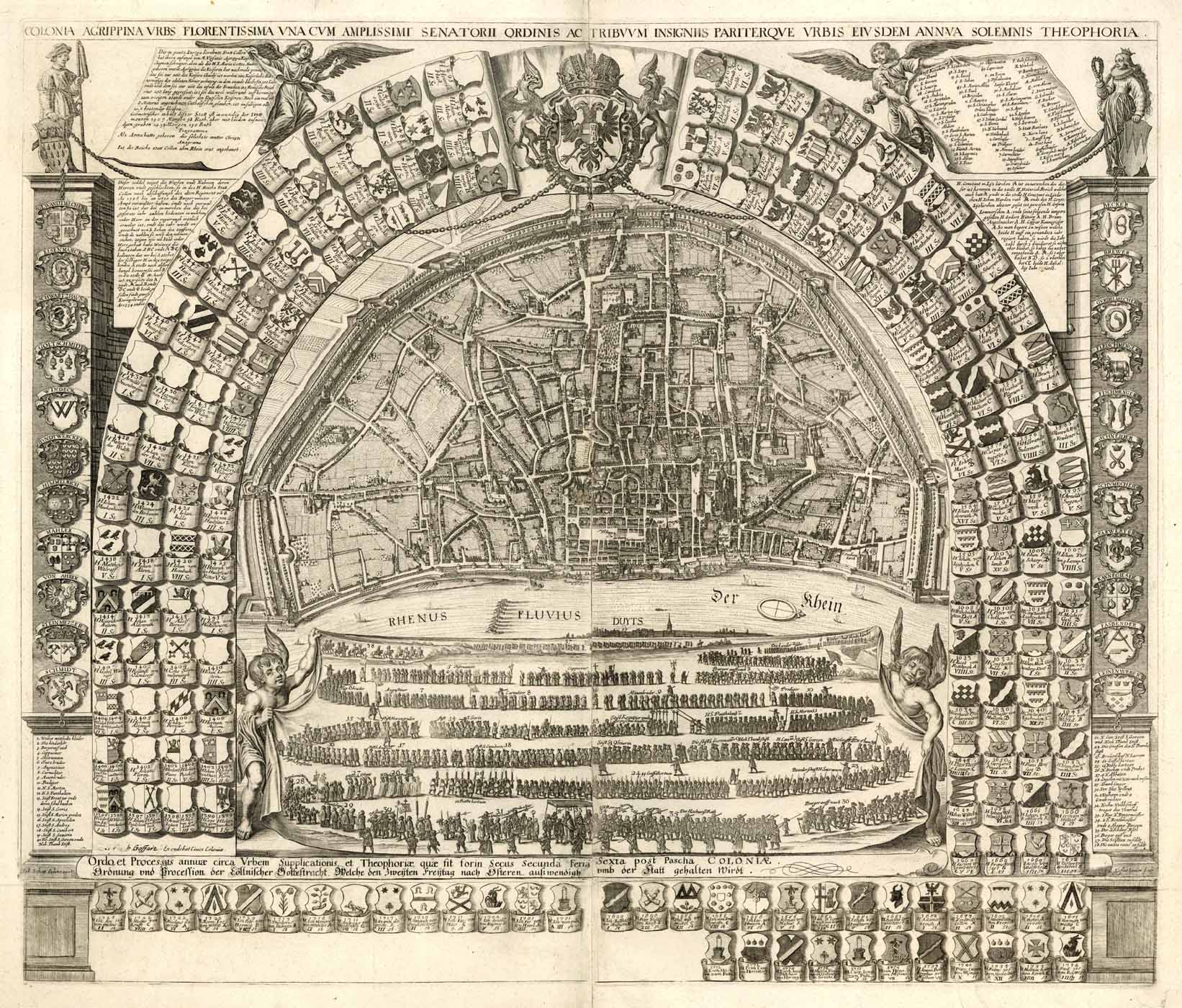 Merlo 774f. Krudwig 99. – Vorliegendes Exemplar mit 11 Wappen in der untersten Leiste). – Sehr seltenes Blatt! – Zeigt Köln aus der Vogelschau, unter Reichsadler und vierreihigem Halbkreis mit Bürgermeister- und Ratsherrenwappen, welche von 1396 in Köln regiert haben. – Unter der Ansicht, von 2 Putten gehalten, die ehemals so prachtvolle grossen Fronleichnamsprozession mit lateinischer und deutscher Unterschrift. – An den Seiten 2 Säulen mit den 22 Wappen der Zünfte. – Links auf der Säule steht der kölnische Bauer mit dem neueren, auf der rechten die Jungfrau mit dem älteren Stadtwappen. – Grosser dekorativer Kupferstich von 3 Platten gedruckt.