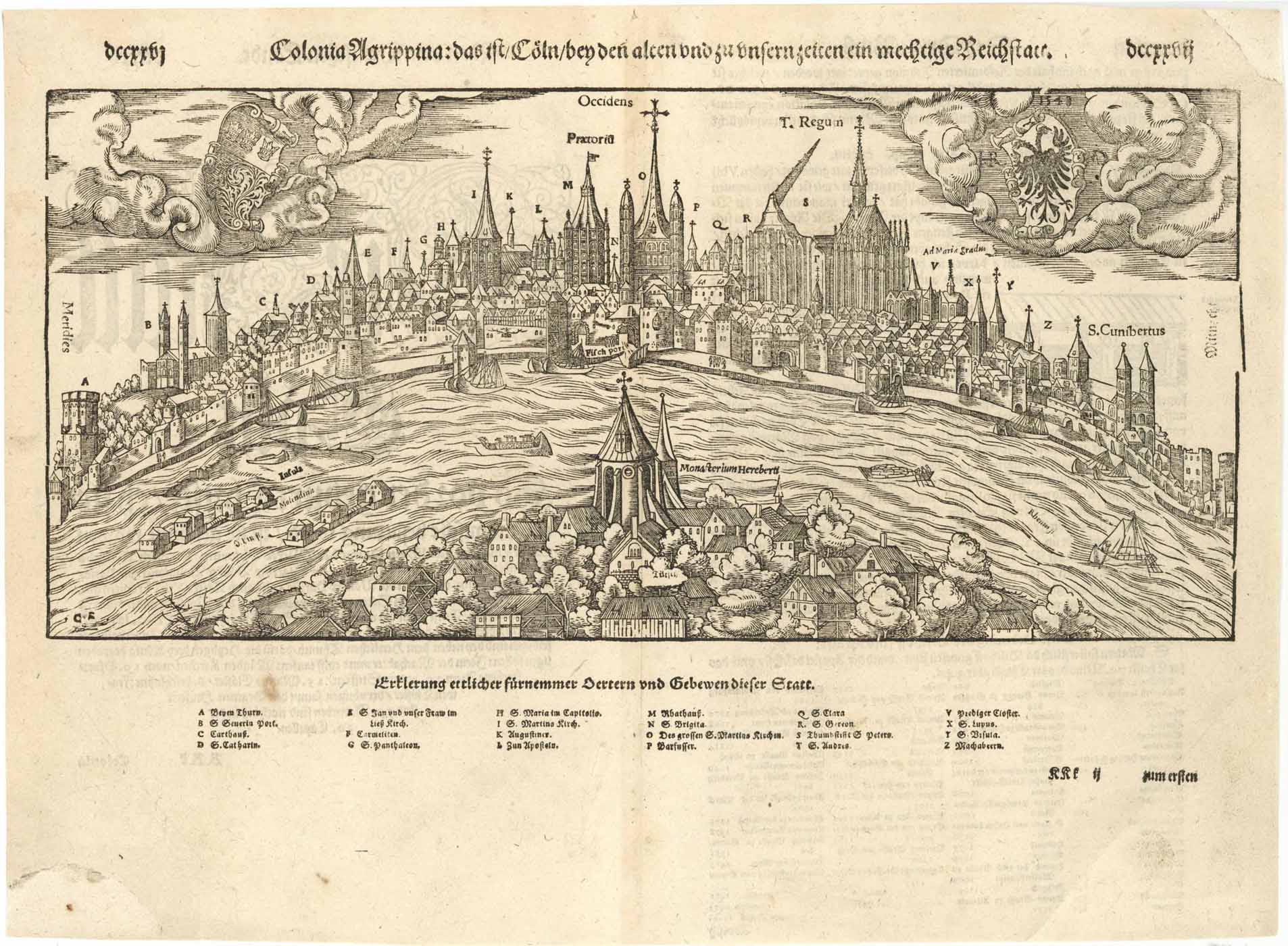Gesamtansicht (‘Colonia Agrippina: das ist Coeln / bey den alten und zu unsern zeiten ein mechtige Reichstatt.’), Holzschnitt v. Christoph Stimmer n. Hans Rudolf Manuel Deutsch aus Sebastian Münsters Cosmographie, 1598, 22 x 36,5 cm