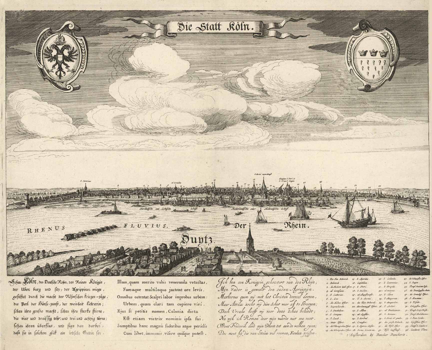 Nicht bei Sievers, Köln von seiner schönsten Seite, vgl. jedoch 39.1u. 39.2. – Im Himmel Titel auf Schriftband; links und rechts Reichs- u. Stadtwappen. – Unter dem Blatt Gedicht in deutscher, lateinischer und niederländischer Sprache; daneben Erklärungen von 1 – 56 und Verlegeradresse von Danckerts. – Selten!