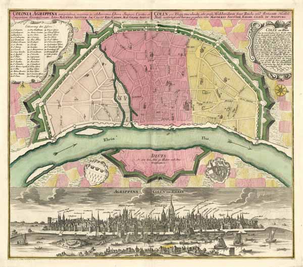 Gesamtansicht; darüber Stadtplan mit Befestigungsanlage (‘Cölln am Rhein eine uhralte, sehr grosse, Hochberühmte freye Reichs- und florisante Handel=Statt’), altkolorierter Kupferstich b. Matthäus Seutter in Augsburg, n. 1741, 49 x 56,5 cm