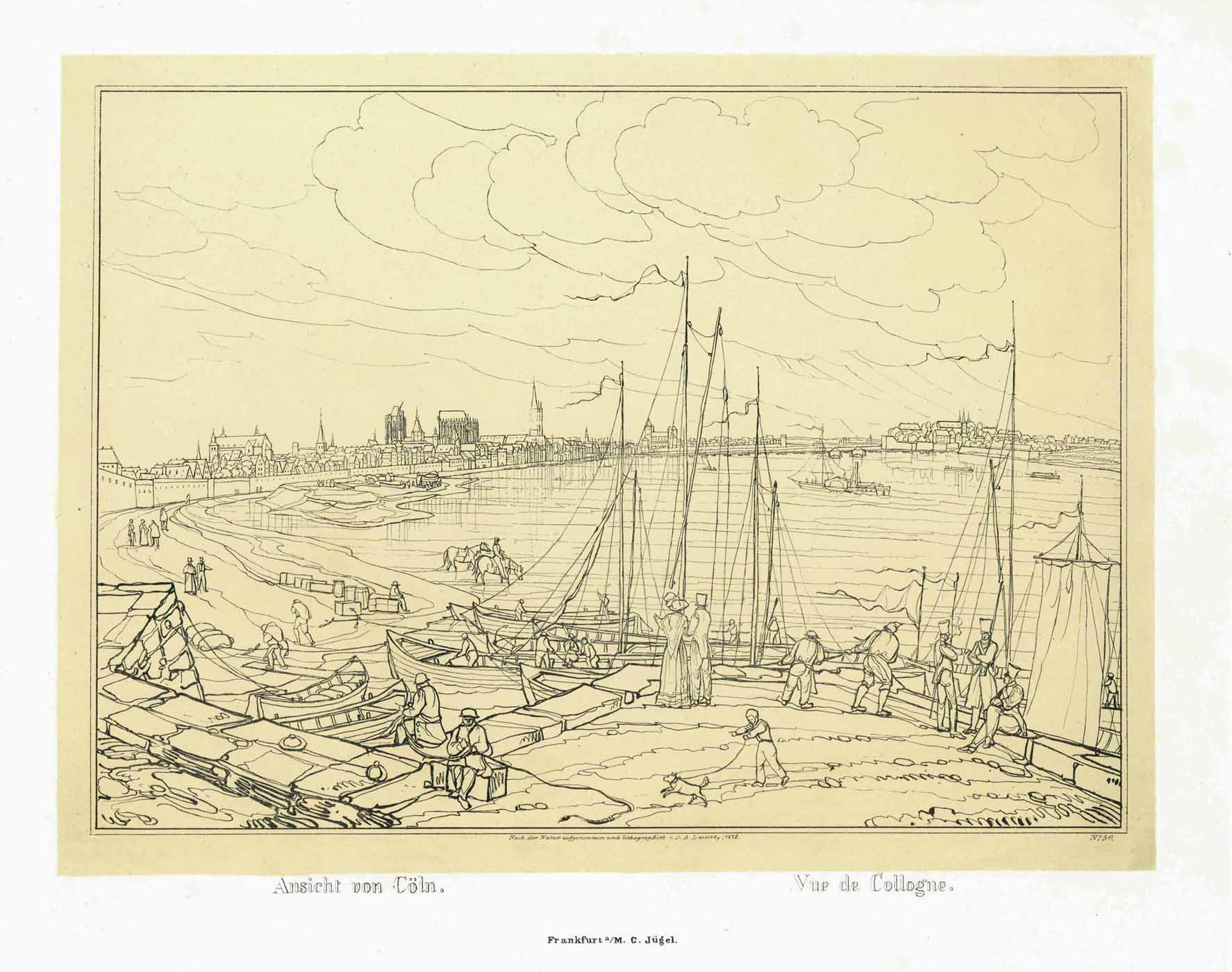 Gesamtansicht von Süden; im Vordergrund Hafen mit Personenstaffage (‘Ansicht von Cöln. – Vue de Collogne’), Umrißlithographie mit Tonplatte v. Lasinsky, 1828, 23,5 x 29,5 cm