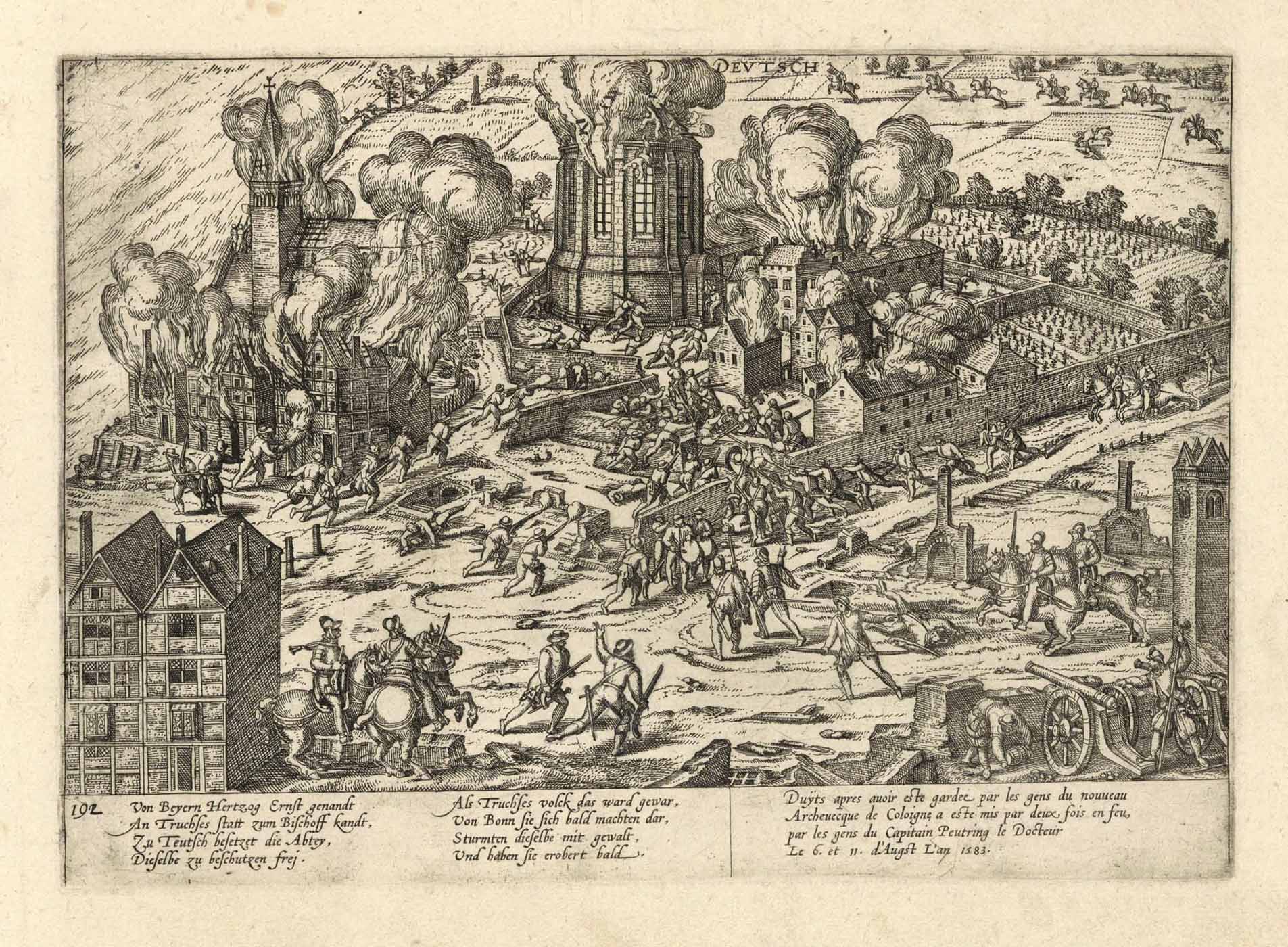 Ansicht mit dem gelegten Brand durch die Truchsessischen Truppen am 6.11.1583 (‘Deutsch – 192’), Kupferstich aus Hogenbergs Geschichtsblätter, 1583, 19,5 x 27,5 cm