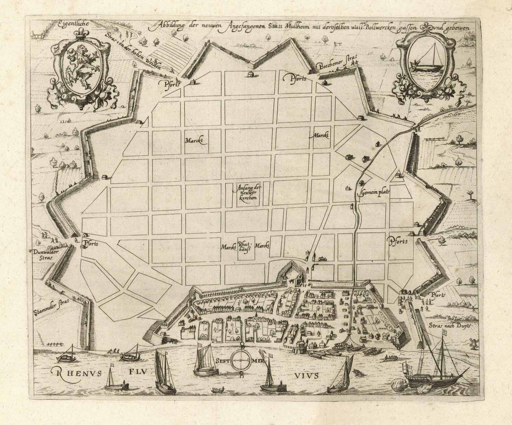 Gesamtansicht aus der Vogelschau i.J. 1614 (‘Eigentliche Abbildung der neuwen Angefangenen Statt Mullheim mit deroselben wall Bollwercken gassen und andern gebewen’), Kupferstich v. Georg Keller aus Mercurii Gallobelgici, … 1612, 24 x 28,5 cm